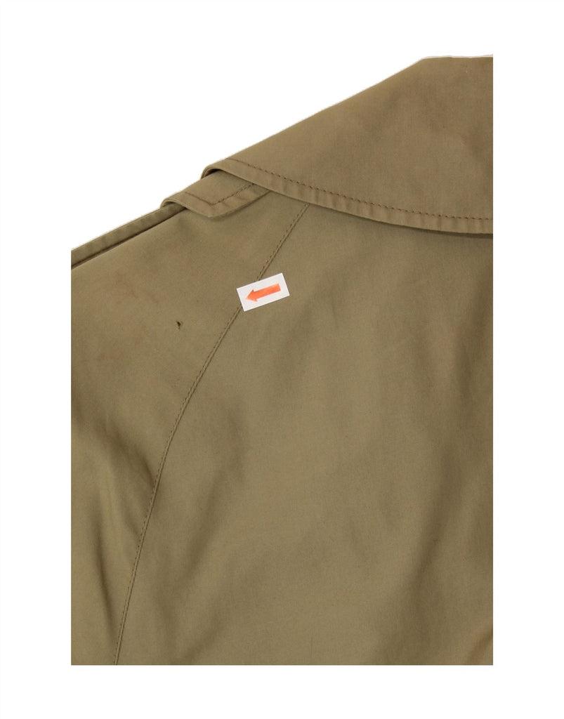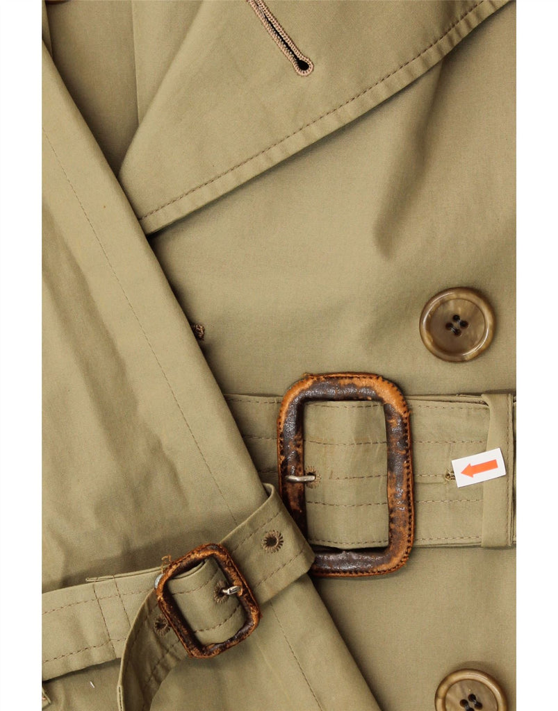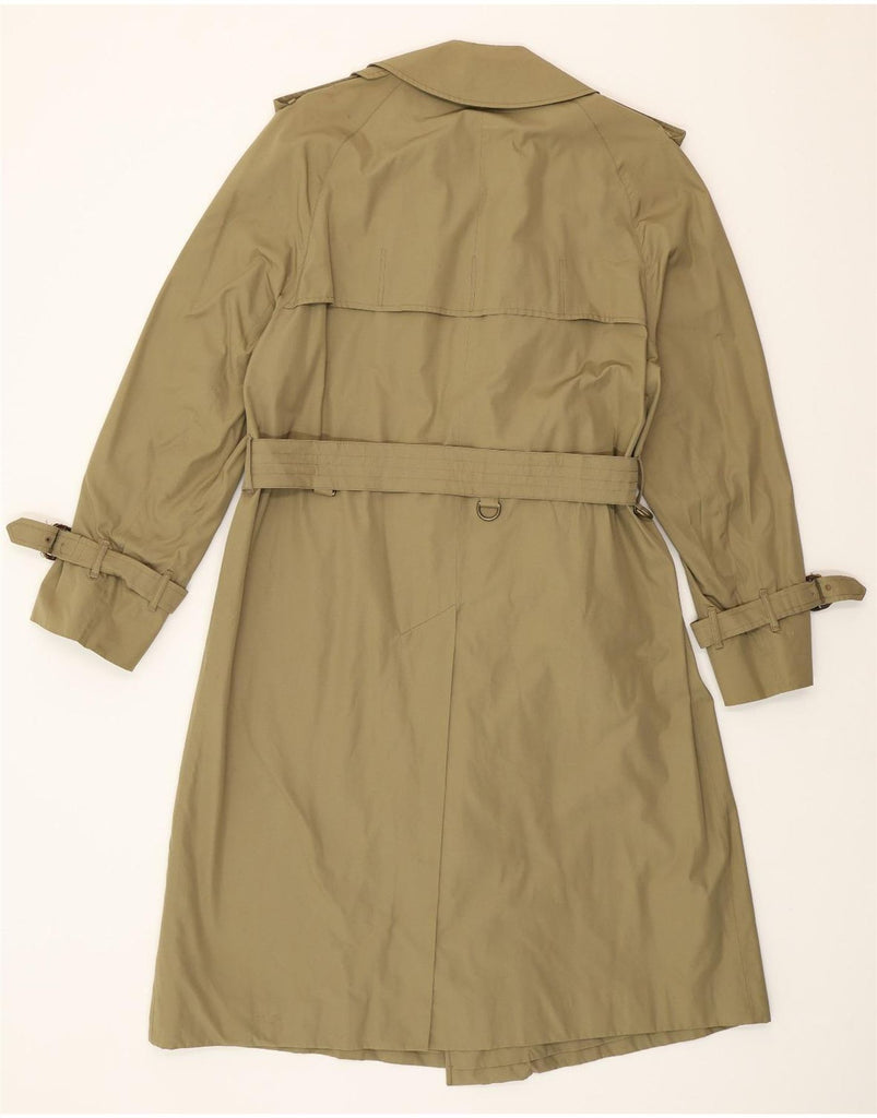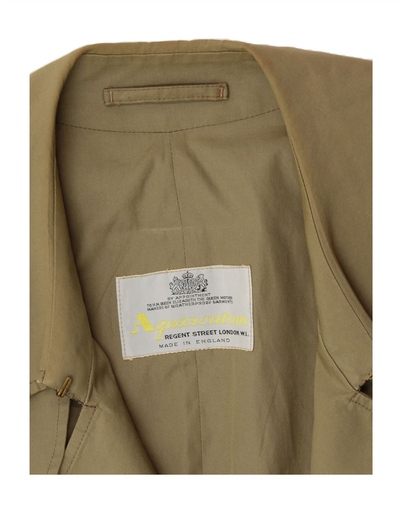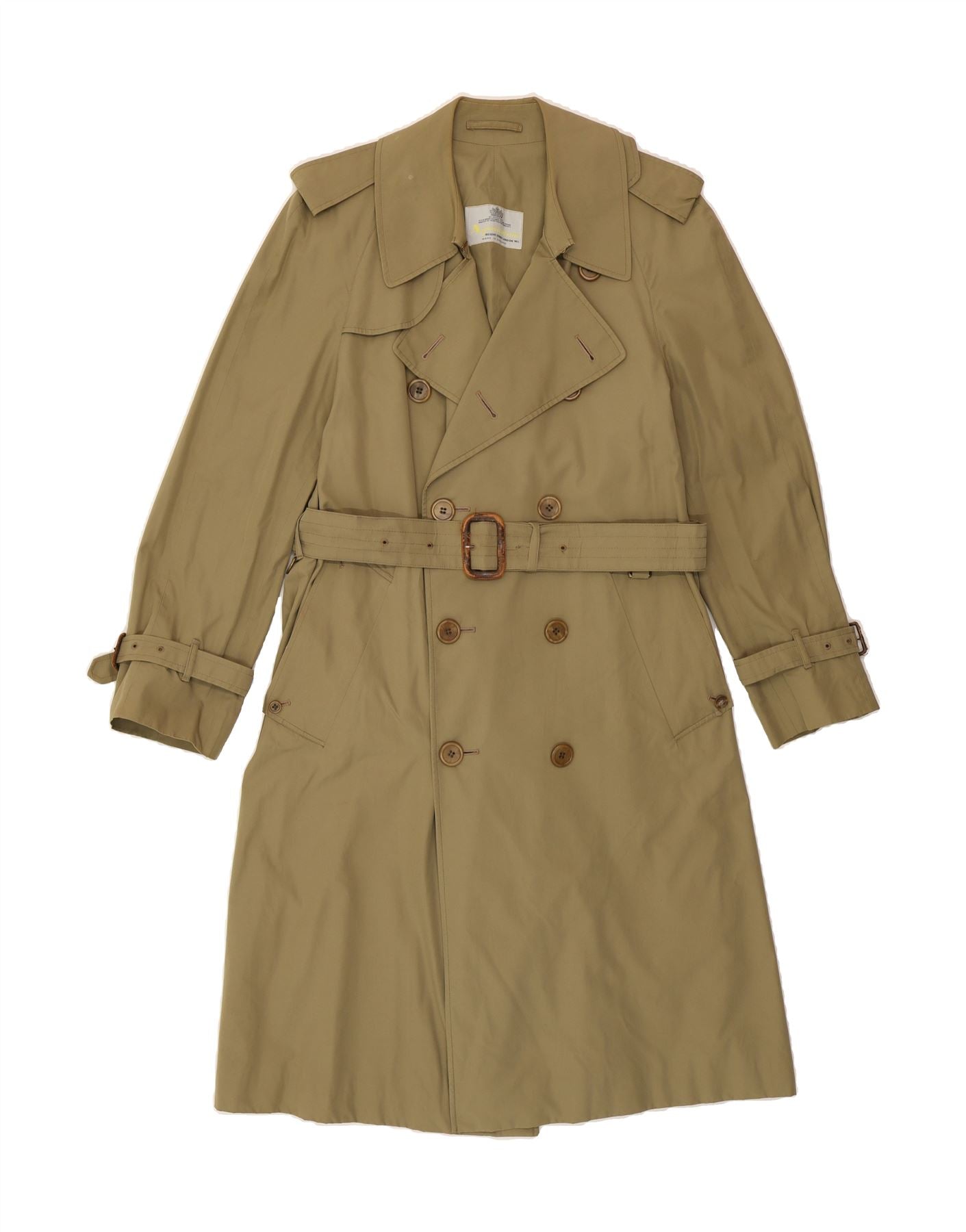 - AI Description: This is a pre-owned Aquascutum men's trench coat in khaki. Crafted from a woven fabric, this classic, regular-fit coat features a double-breasted button closure, long sleeves, and a collared neckline. The coat boasts a belted design and shoulder pads, accented with buckles. It shows minor visible wear throughout, including on the belt and collar, with minor holes or tears on the back. Made in England.