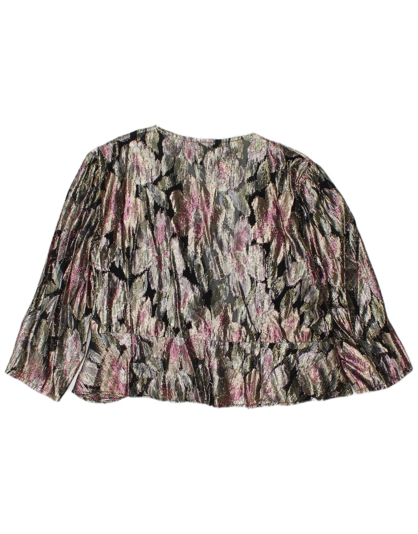 - AI Description: This Ariella womens cardigan sweater is crafted from a shimmering multicoloured viscose blend, featuring lurex for a glitter accent. An abstract floral pattern in black, pink, and gold creates a striking retro look. It features a relaxed, loose fit with a V-neckline and elegant 3/4 sleeves. The woven fabric drapes beautifully, offering a sophisticated and comfortable style.
