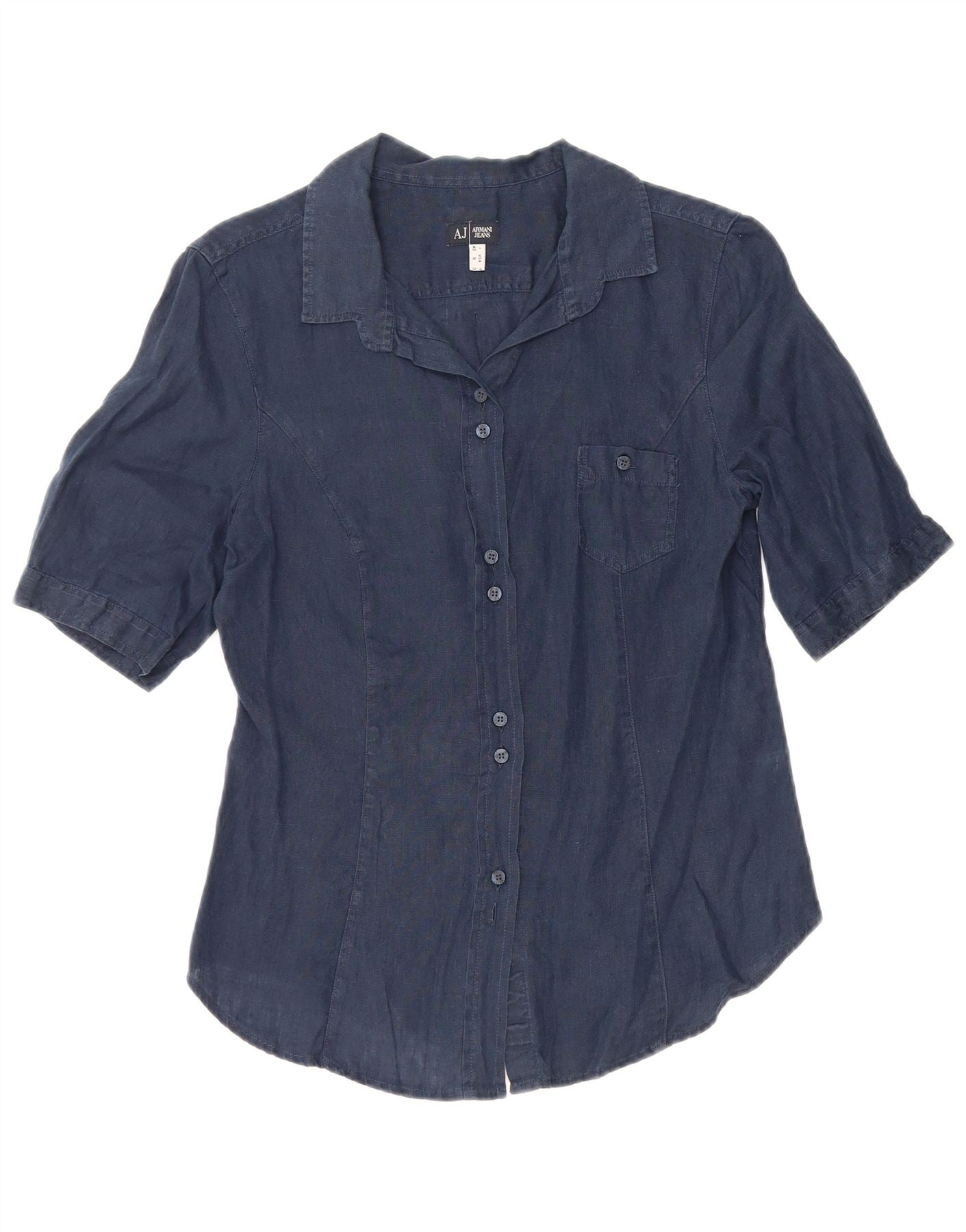 ARMANI JEANS Womens Short Sleeve Shirt Blouse UK 12 Medium Navy Blue Linen