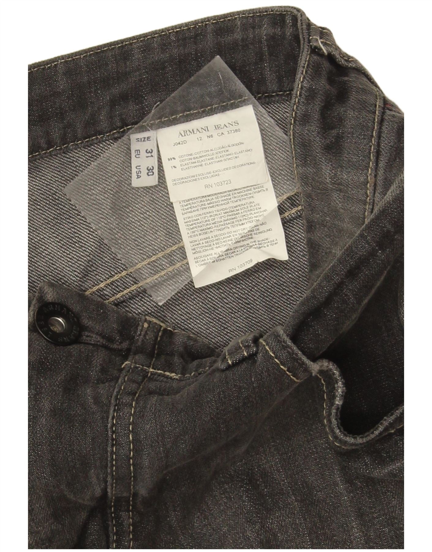 - AI Description: This Armani Jeans mens slim jeans are crafted from black stretch denim. The fabric offers both comfort and a sleek silhouette. A button closure secures the front. The slim fit design tapers neatly through the leg. Rear zipped pockets add a distinctive, modern detail. This style combines classic denim appeal with contemporary tailoring.