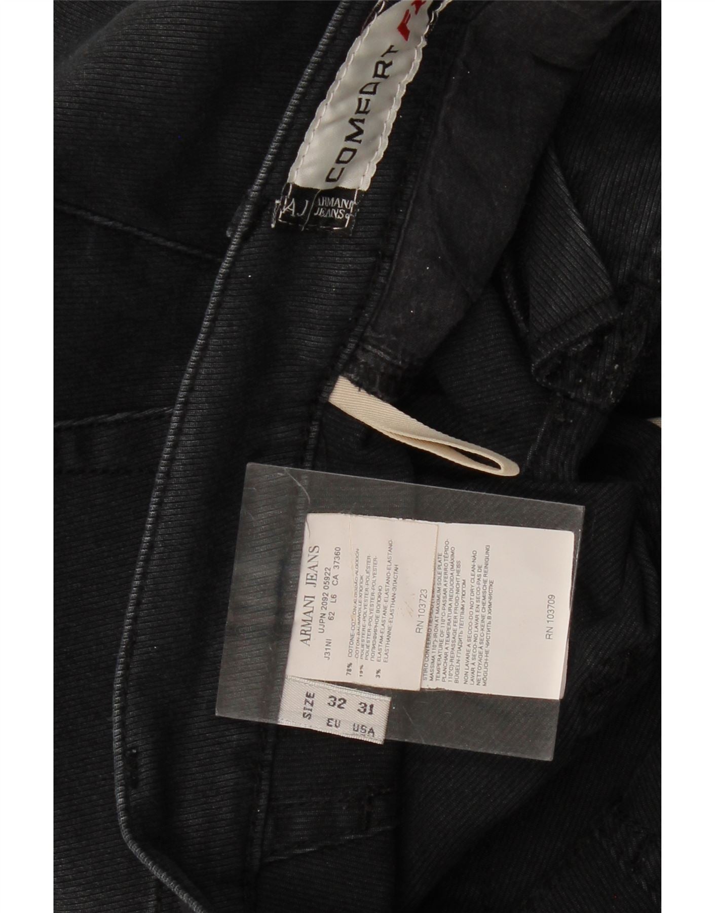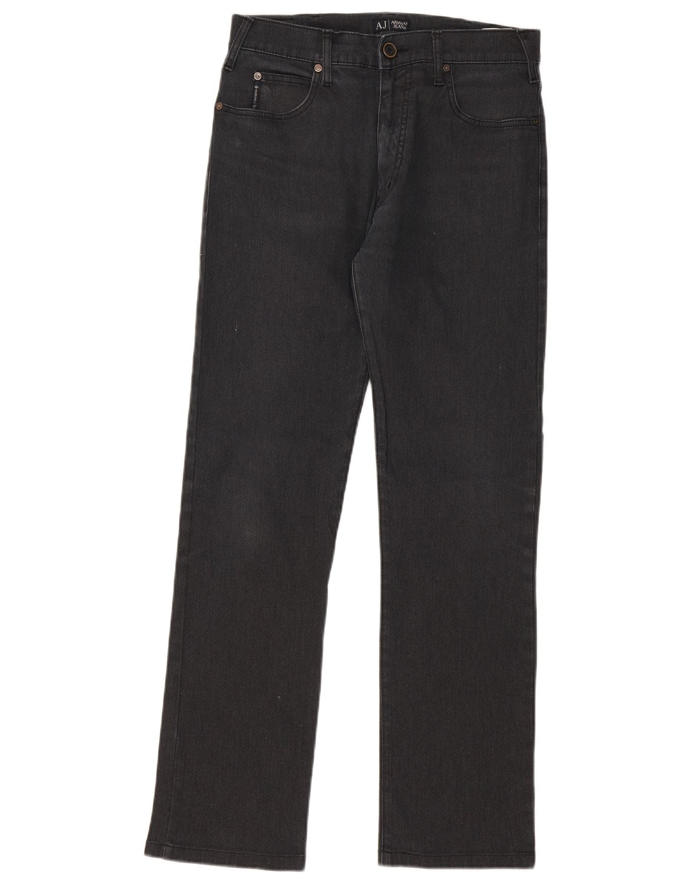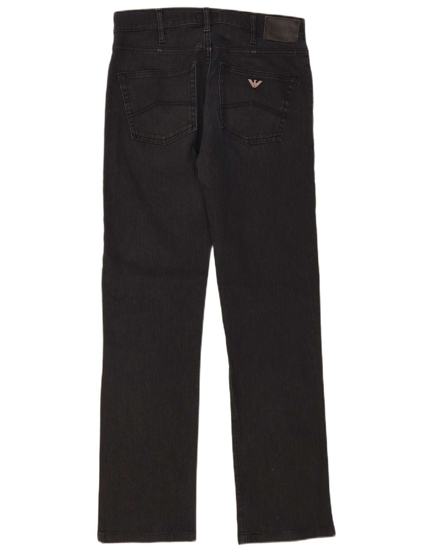 - AI Description: This Armani Jeans mens straight jeans are crafted from a black blended fabric, offering both durability and stretch for ultimate comfort. They feature a classic straight leg and a regular fit, ensuring a timeless silhouette. The button closure provides a secure and traditional fastening. Designed with practical pockets, these jeans are enhanced by a subtle brand logo accent. The comfort fit makes them ideal for everyday wear.