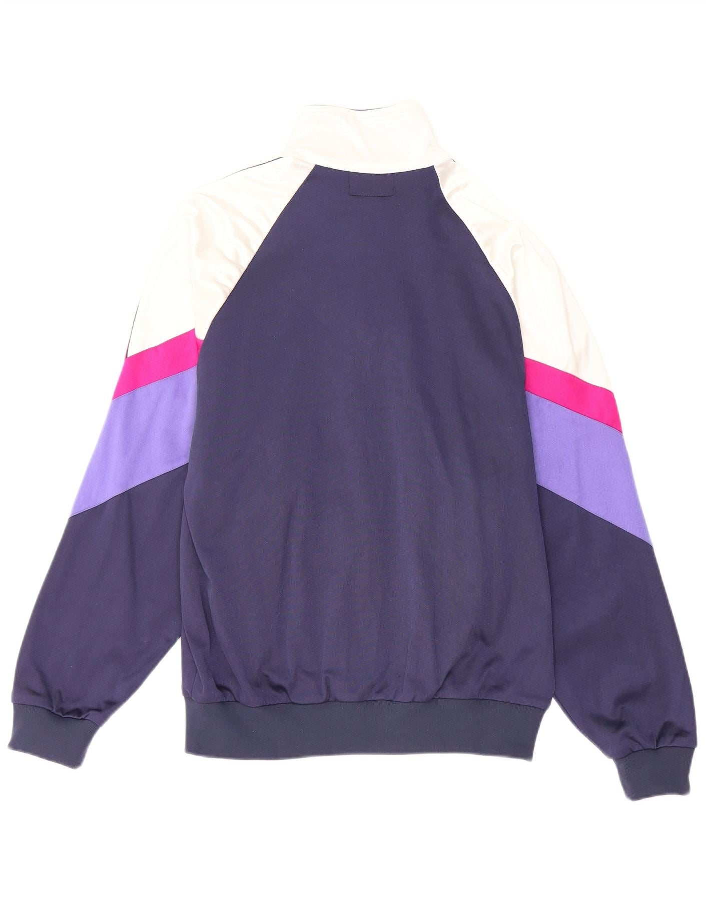 - AI Description: This Asics womens tracksuit top jacket is crafted from a smooth nylon blend fabric. It features a striking multicoloured colourblock design in white, navy blue, purple, and pink. The collared neckline and full zip closure offer a classic athletic look. Long sleeves and a regular fit ensure comfort. Practical pockets and a subtle Asics logo complete the design. Graphic detailing on the sleeves adds a distinctive touch.