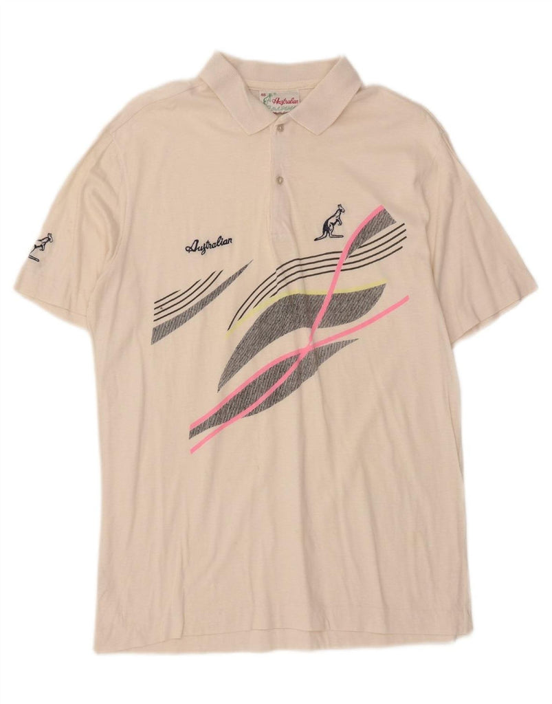 - AI Description: This Australian mens Polo Shirt is crafted from 100 percent cotton knit, offering a breathable off white texture. It features a classic collared neckline and a button-up front for a smart, athletic look. Short sleeves and a regular fit ensure comfortable wear and ease of movement. The design includes a distinctive graphic and an accent logo, perfect for sports enthusiasts.
