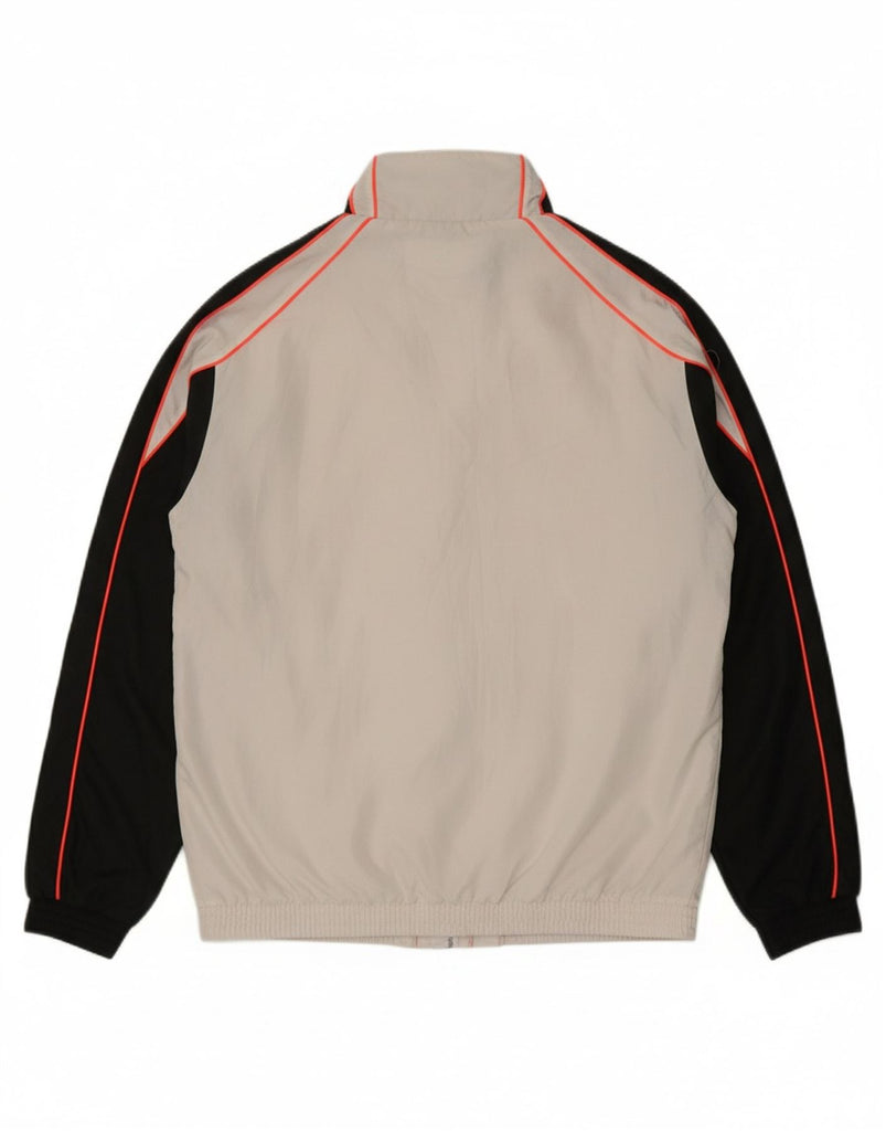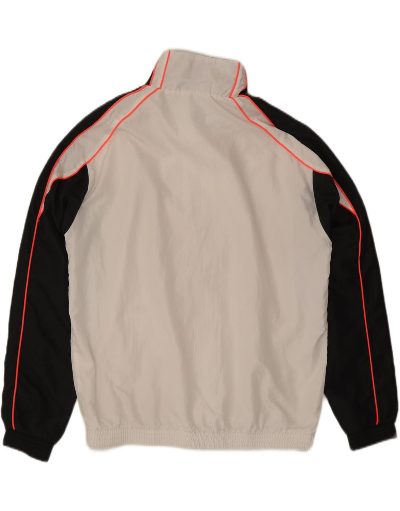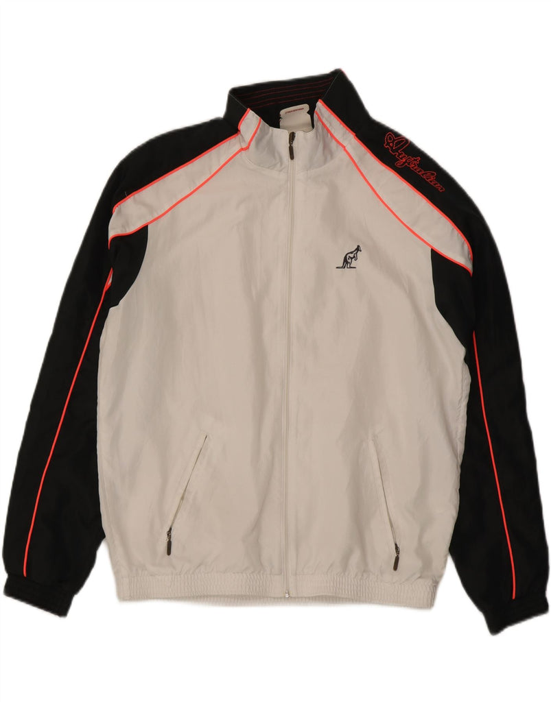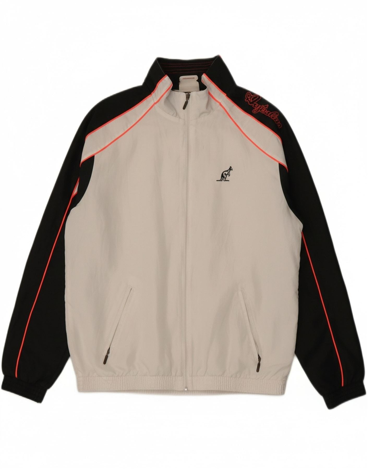 - AI Description: This Australian men's tracksuit top jacket is crafted from lightweight woven fabric in white. It features a collared neckline and long sleeves, ensuring a comfortable regular fit. The full-zip front offers versatility, while practical pockets are included. A distinctive colourblock pattern adds a retro sports aesthetic. This windproof design is completed with a prominent brand logo, perfect for active wear.