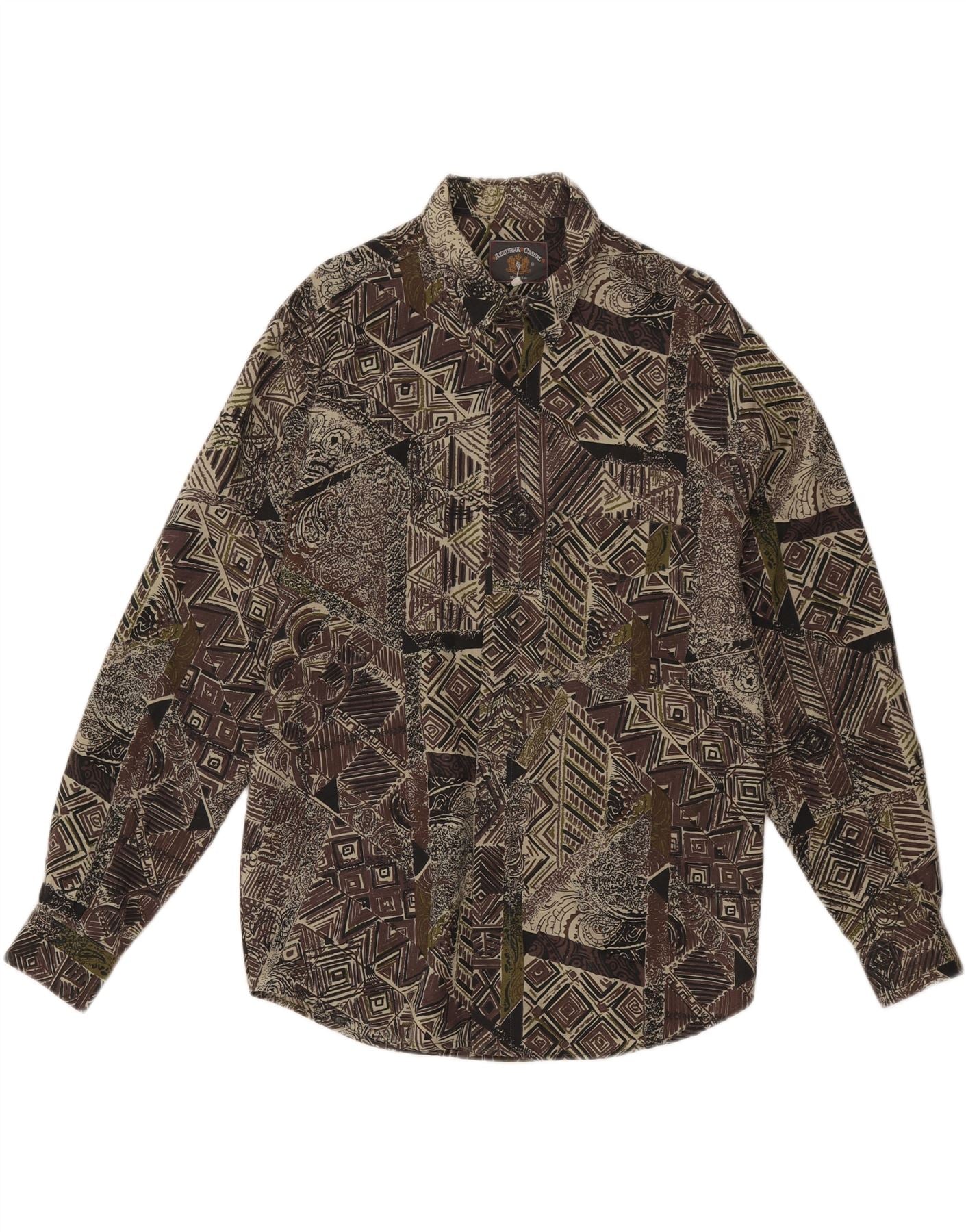 - AI Description: This Azzurra Casual mens shirt is crafted from a woven fabric, offering a comfortable texture. It features a striking multicoloured geometric and abstract pattern in shades of brown, green, and beige. The collared neckline and long sleeves provide a classic silhouette. A button closure runs down the front. It includes practical pockets. The regular fit ensures comfortable wear. This retro style shirt offers a distinctive look.