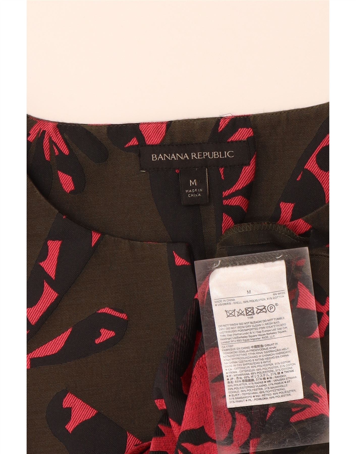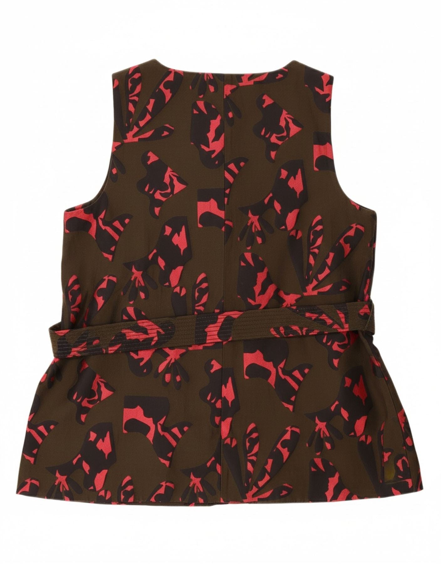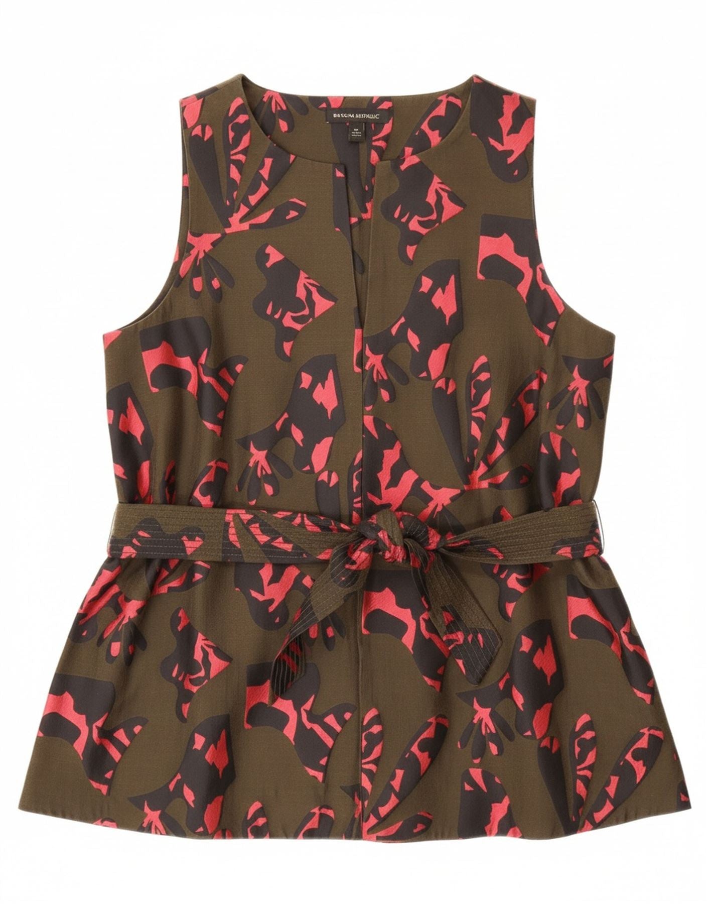 - AI Description: This Banana Republic womens blouse top is crafted from a smooth polyester and cotton blend. The khaki camouflage print offers a modern abstract pattern. A V-neckline and sleeveless cut create a clean silhouette. The pullover design features an adjustable waist for a custom belted fit, secured with a chic bow accent. This regular fit top offers contemporary style.
