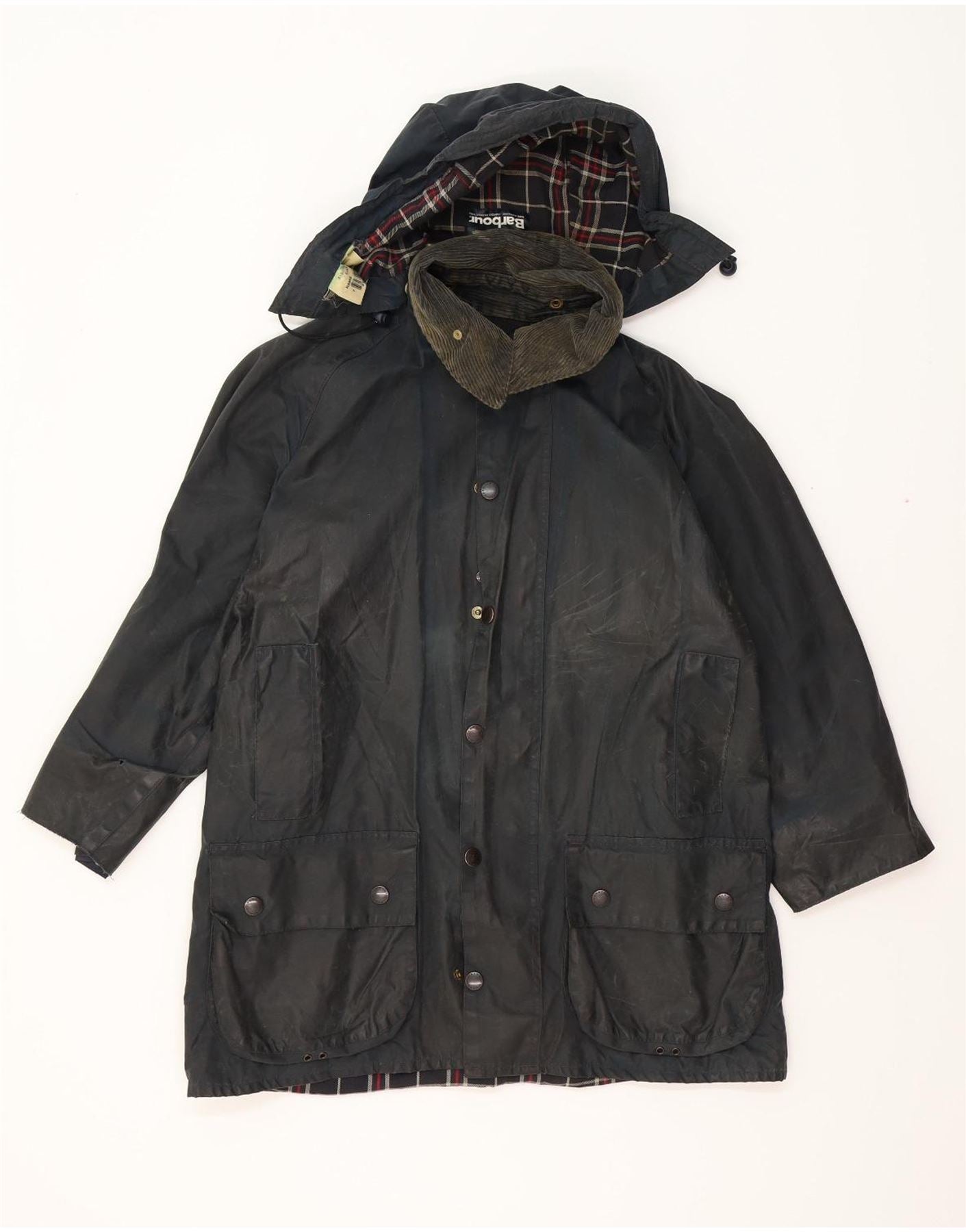 - AI Description: This Barbour mens waxed cotton jacket is crafted from durable, water resistant woven fabric in navy blue. It features a classic collared neckline and long sleeves. The jacket includes a practical hood and a button closure. A subtle plaid pattern adds traditional charm. Multiple pockets offer functionality. A discreet logo provides brand recognition. The regular fit ensures comfortable wear, perfect for classic style.