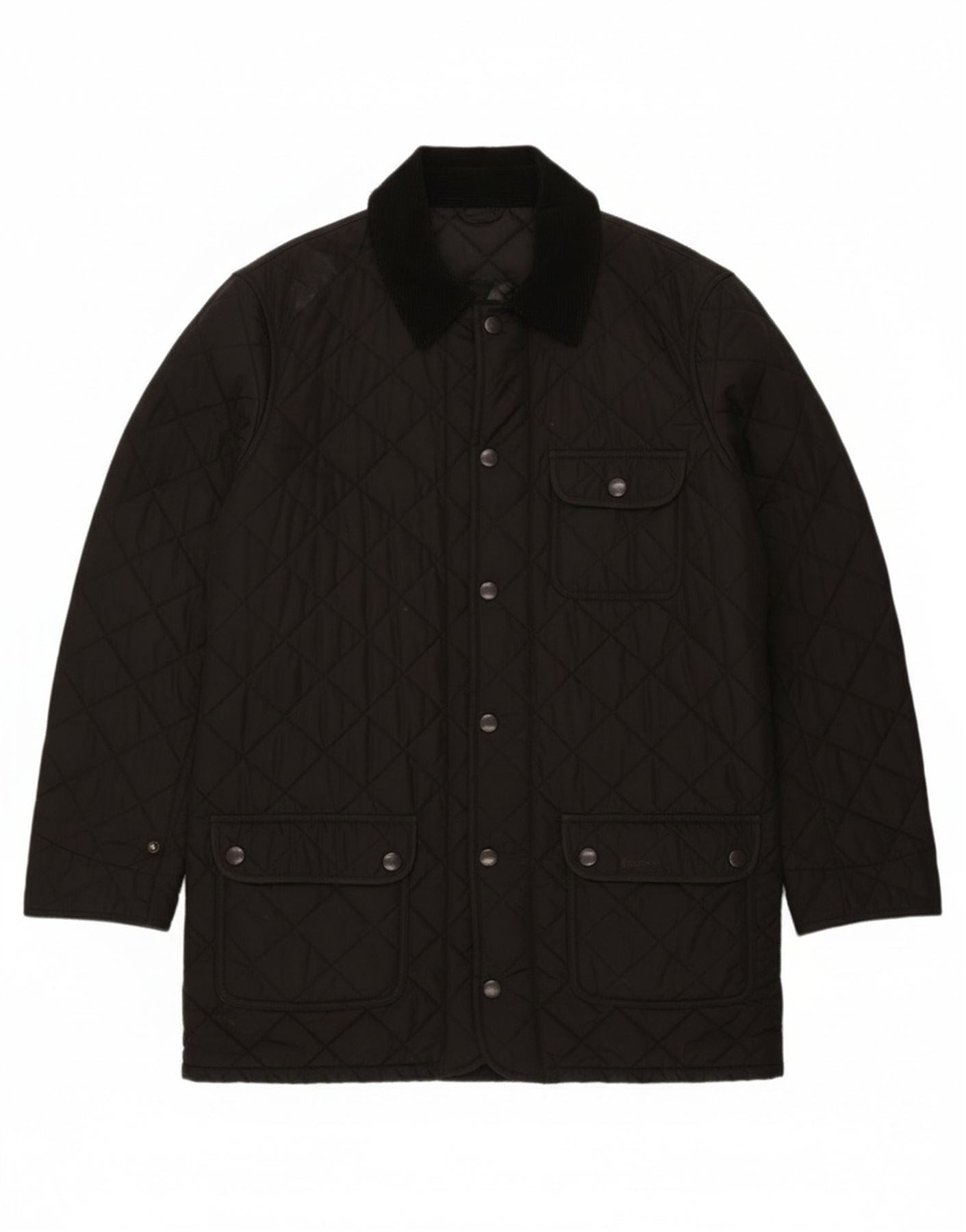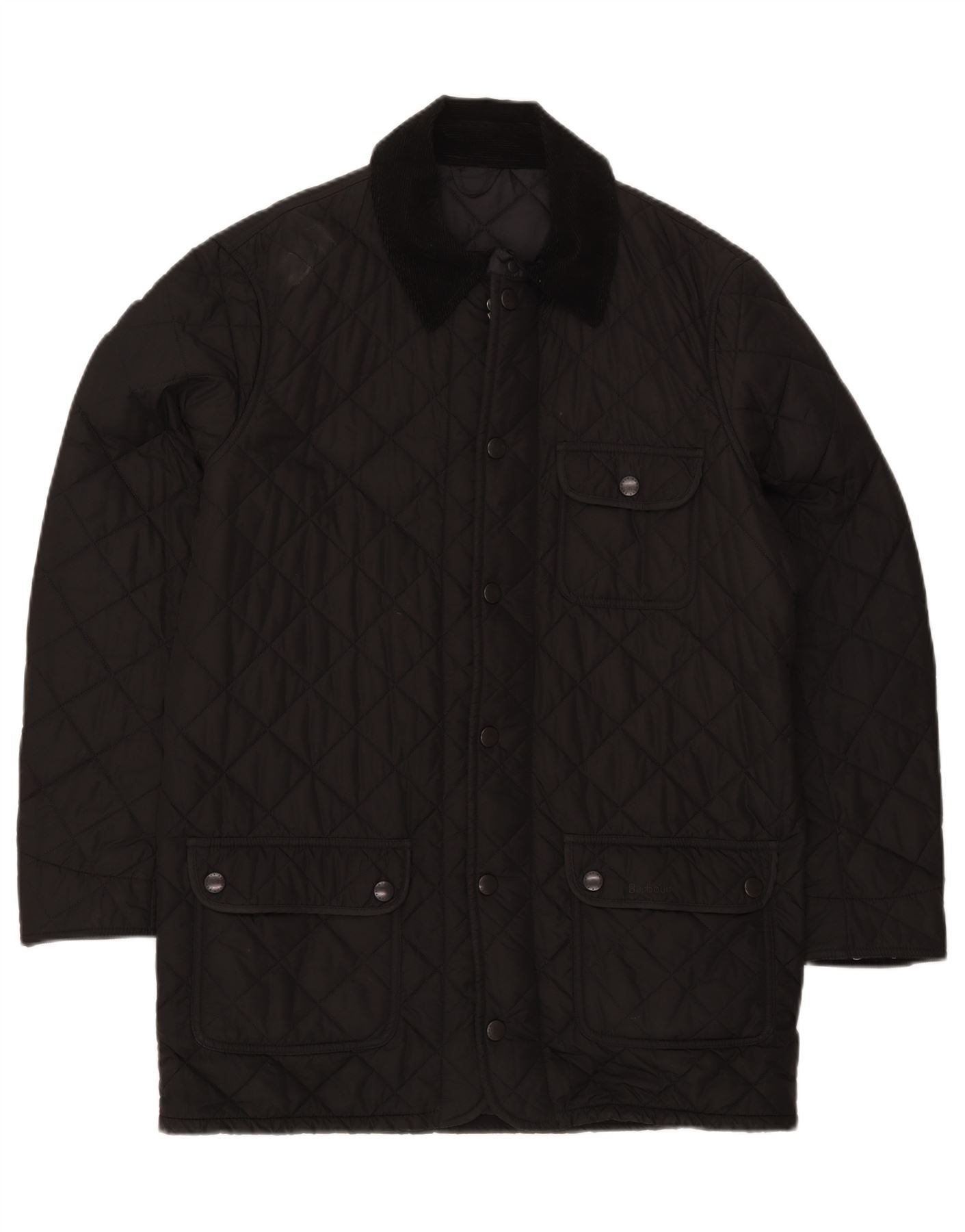 - AI Description: This Barbour mens quilted jacket is crafted from a black woven fabric, featuring a classic diamond quilted pattern. It has a distinguished corduroy collar and a full button-up front closure. Long sleeves and a regular fit ensure comfortable wear. Multiple pockets provide practical utility. This thermal jacket offers a timeless, classic style.