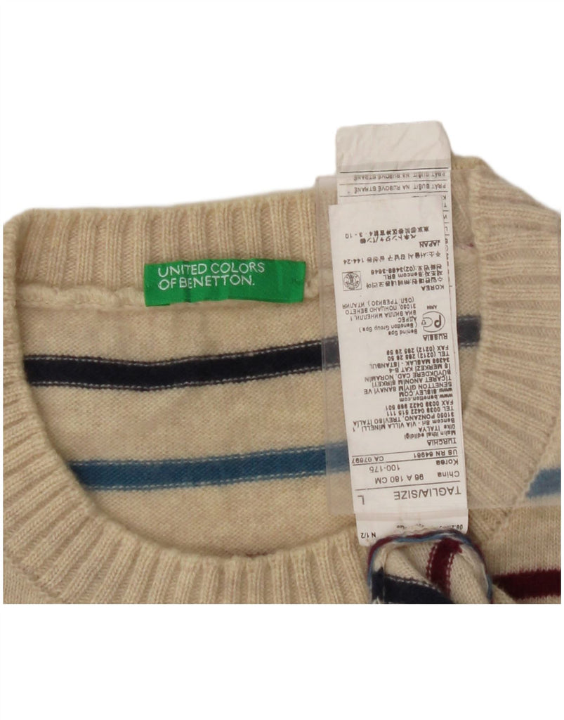 BENETTON Mens Crew Neck Jumper Sweater Large Off White Striped Wool