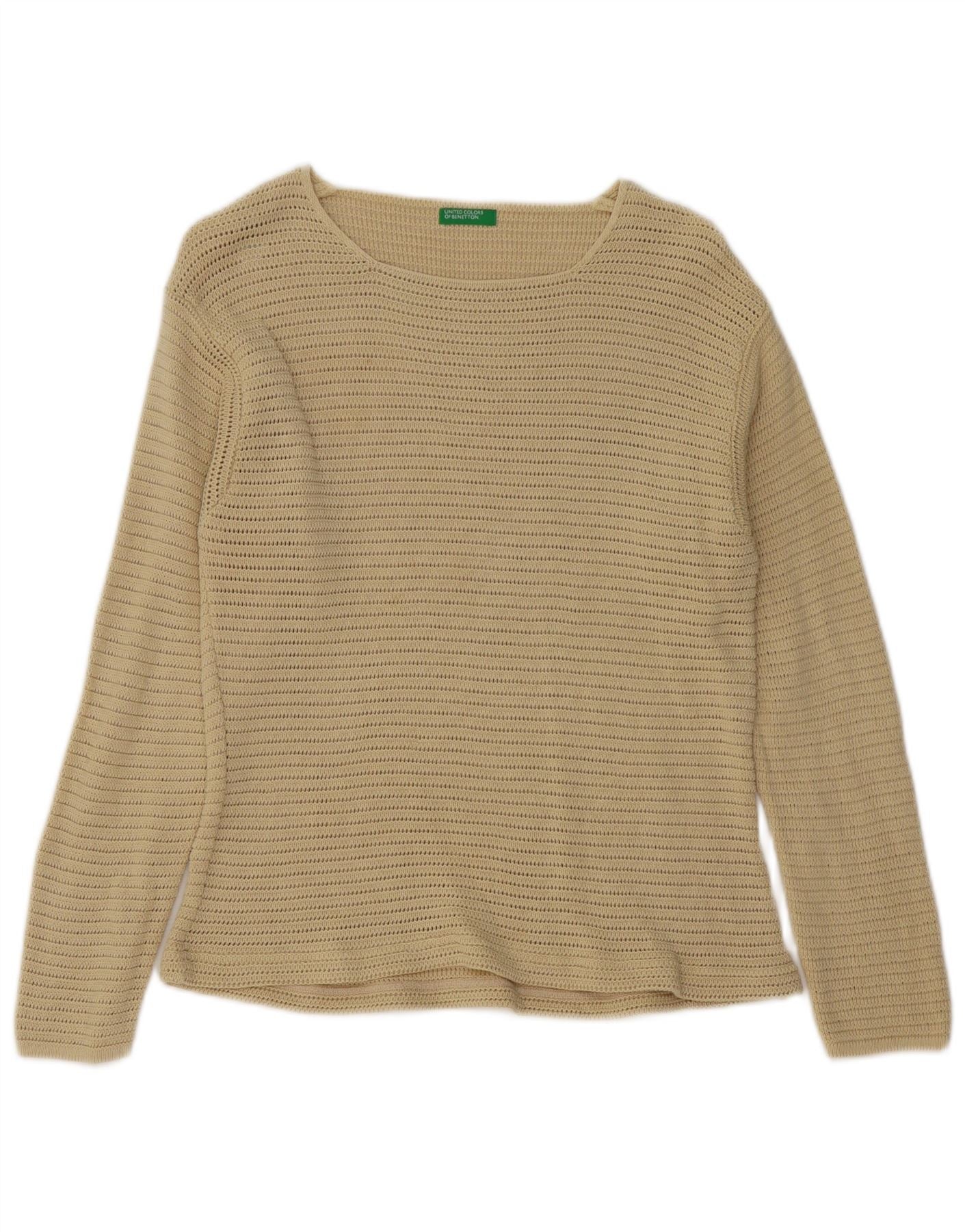 BENETTON Womens Crochet Boat Neck Jumper Sweater UK 12 Medium Beige Cotton