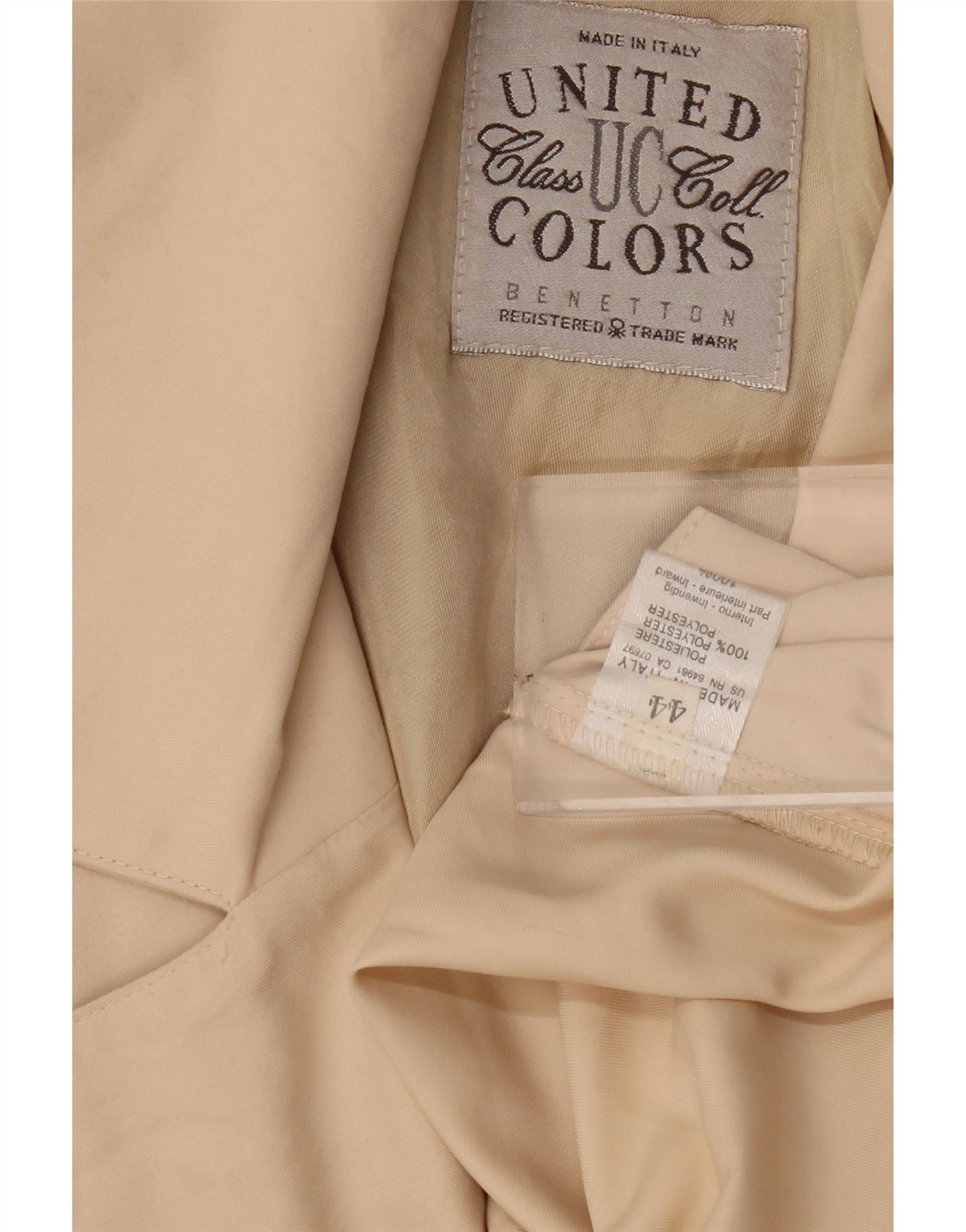 - AI Description: This Benetton womens blazer jacket is crafted from a lightweight beige woven polyester. It features a classic collared neckline and a simple button-up front closure. The short sleeves and loose fit offer a relaxed, comfortable silhouette. Practical pockets are integrated into the design. This lined jacket provides a clean finish and a versatile, retro-inspired style.