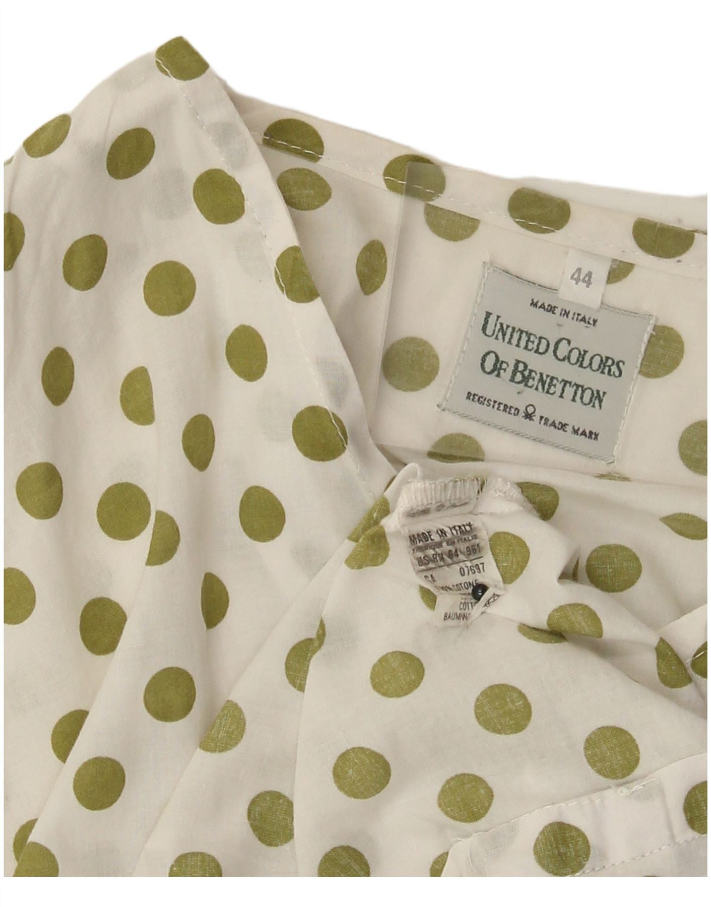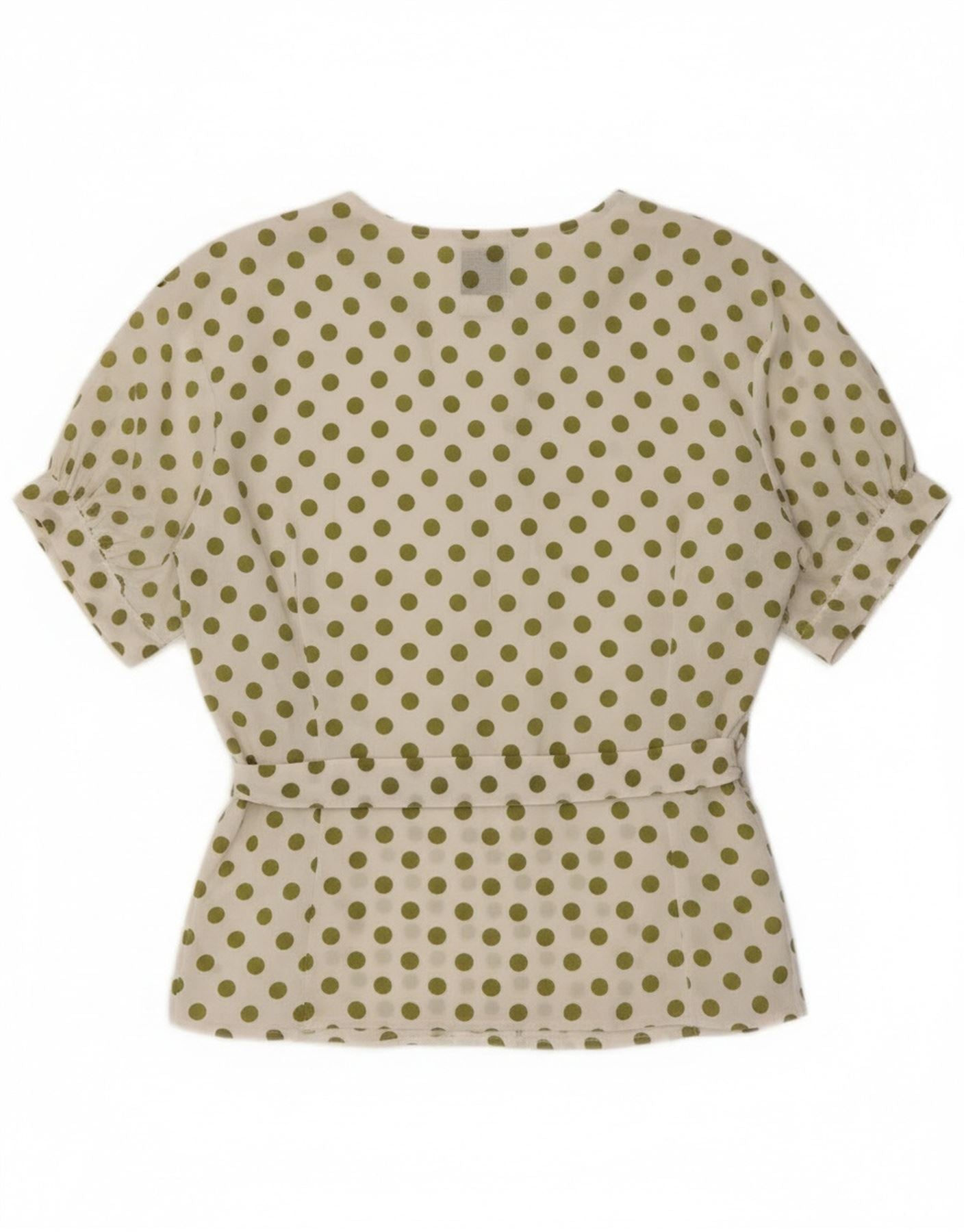 - AI Description: This United Colors Of Benetton womens blouse top is crafted from lightweight woven cotton, offering a crisp yet comfortable feel. It features a playful polka dot pattern in green against a clean white background. The V-neckline and short sleeves provide a relaxed silhouette. A full button-up front adds classic detail. Designed with a loose fit, it includes an adjustable wrap waist for versatile styling. This piece combines comfort with a charming, casual aesthetic.