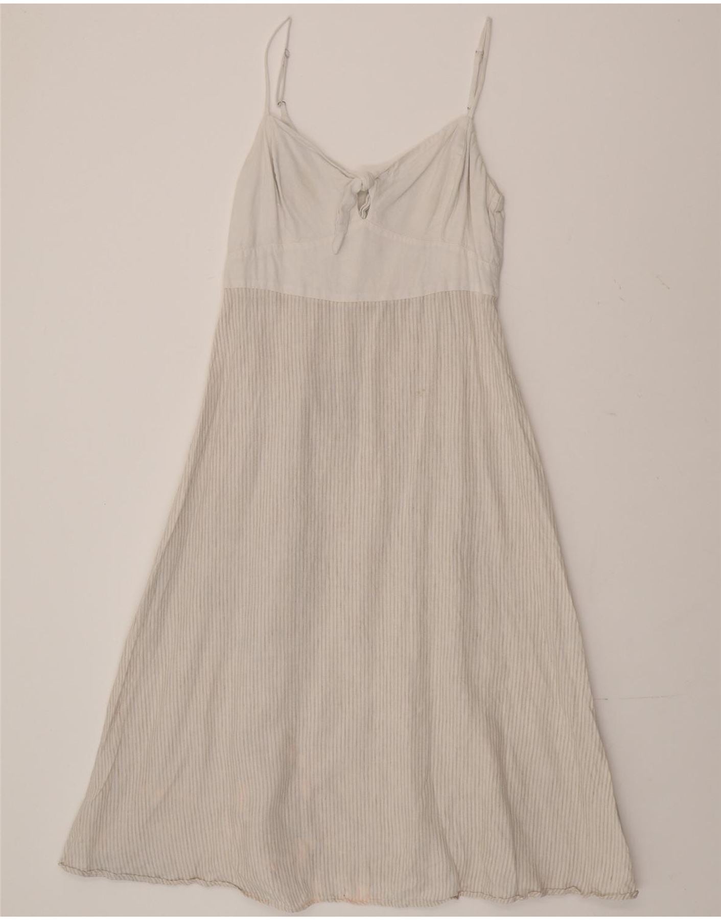 - AI Description: This Benetton womens slip dress is crafted from pure linen, offering a lightweight, woven texture. It features an off white colour with a subtle striped pattern. The sleeveless design includes delicate straps and a flattering V-neckline. An empire waist accentuates the silhouette, leading to a relaxed fit skirt. A small bow detail adorns the front, adding a charming touch. A zip closure ensures a smooth fit.