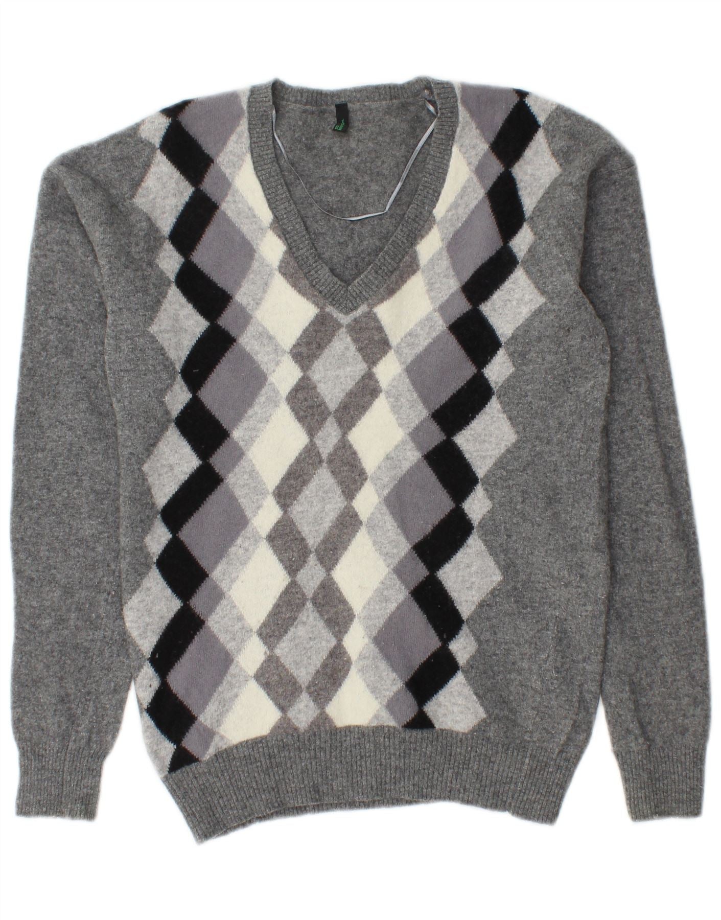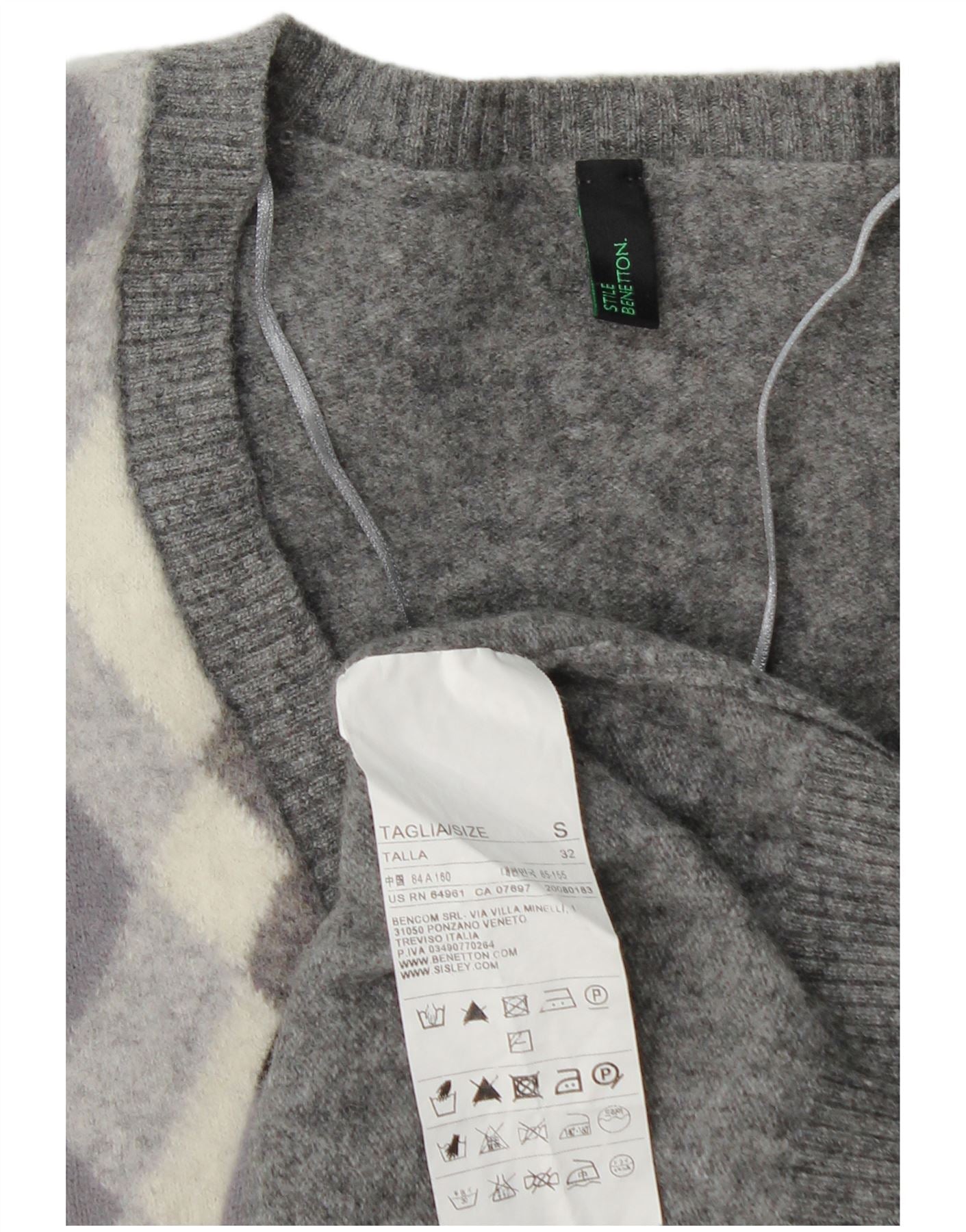 BENETTON Womens V-Neck Jumper Sweater UK 10 Small Grey Argyle/Diamond Wool