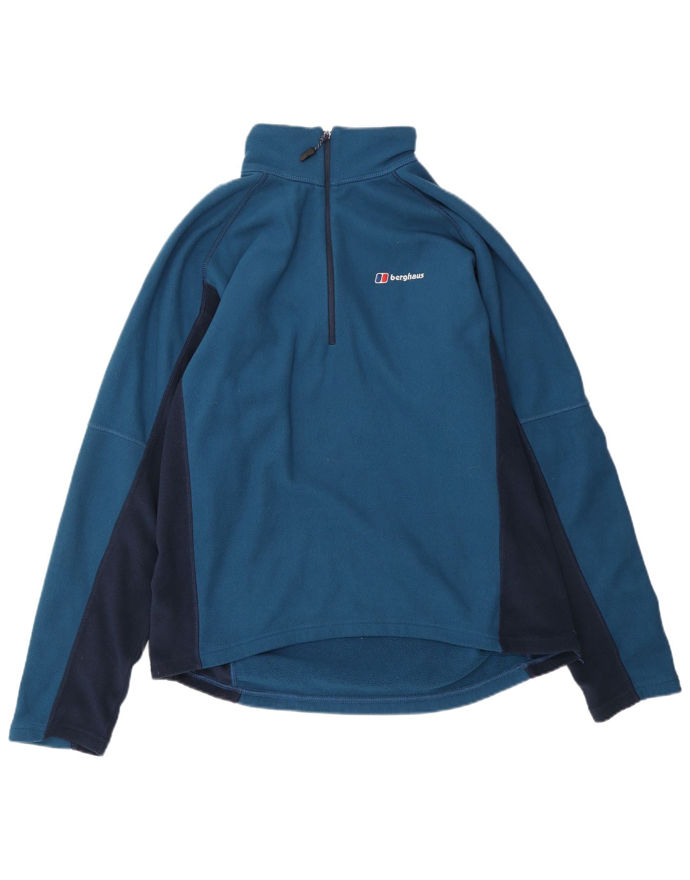 - AI Description: This Berghaus mens sweatshirt jumper is crafted from soft blue fleece, offering lightweight thermal comfort. It features a mock neck and a practical 1/4 zip closure. Long sleeves provide ample coverage. The regular fit ensures comfortable wear. A distinctive spell-out logo adds a classic branded touch.