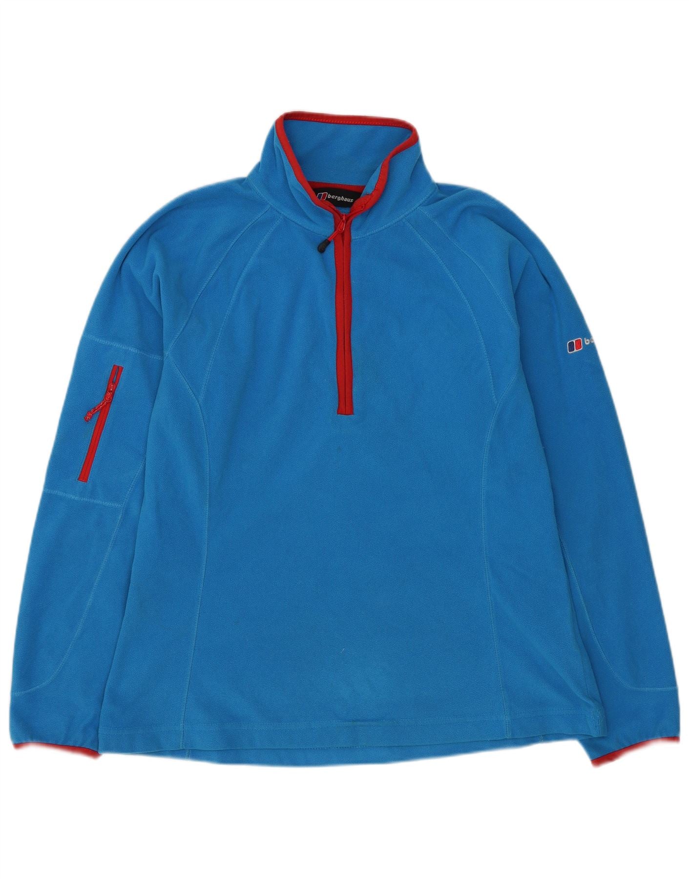 - AI Description: This Berghaus womens sweatshirt jumper is crafted from soft blue fleece, offering warmth and comfort. It features a mock neck and long sleeves. The regular fit ensures ease of movement. A contrasting red 1/4 zip closure adds a pop of colour. There is a practical zipped pocket on the sleeve, also in red. Red trim details the cuffs and hem, completing the design with a sporty touch.