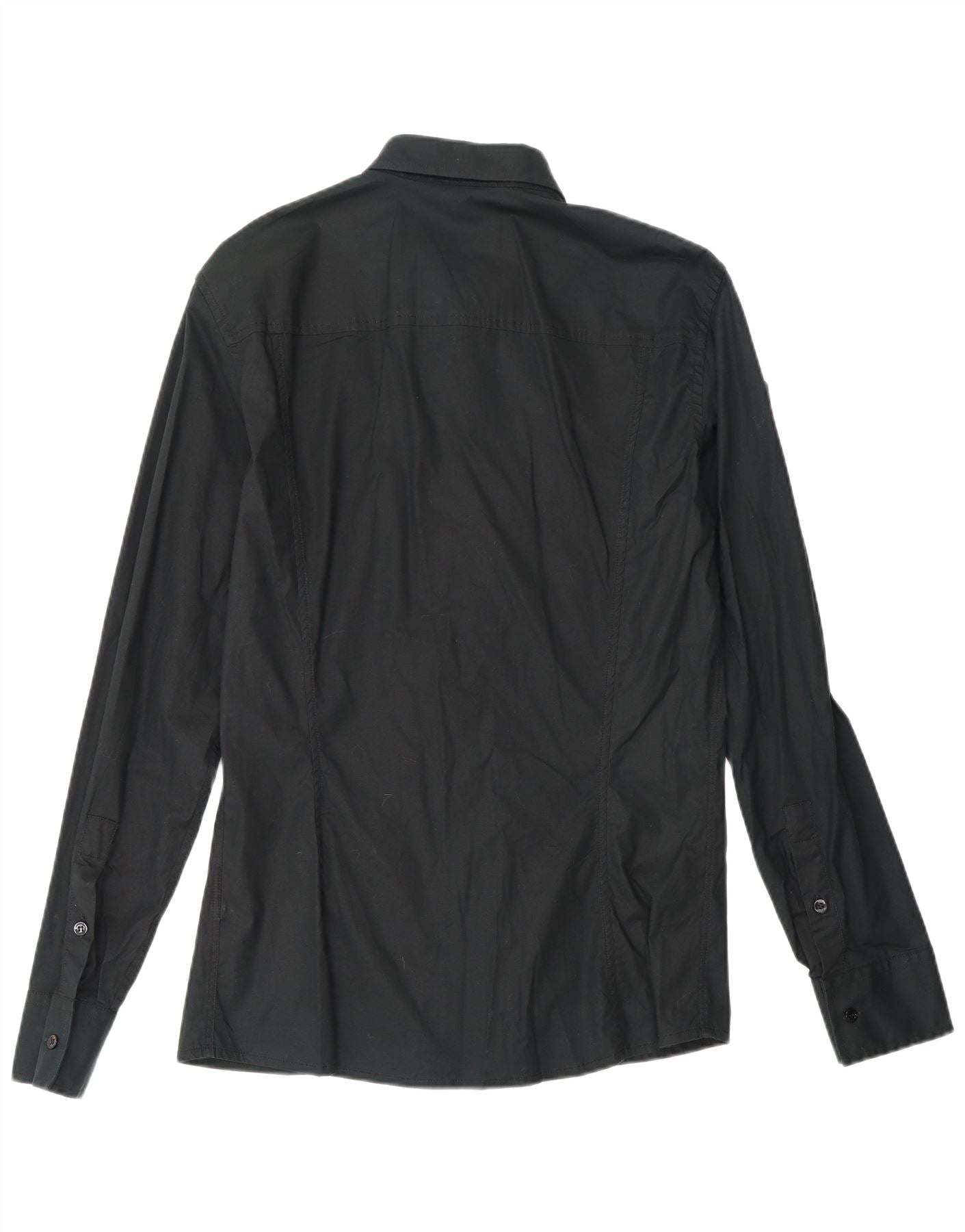 - AI Description: This Bikkembergs mens shirt is crafted from a black cotton blend fabric, offering a comfortable stretch. It features a classic collared neckline and long sleeves with buttoned cuffs. The button-up front closure is neatly detailed. A single chest pocket adds a practical touch. Its regular fit ensures a smart yet comfortable silhouette.