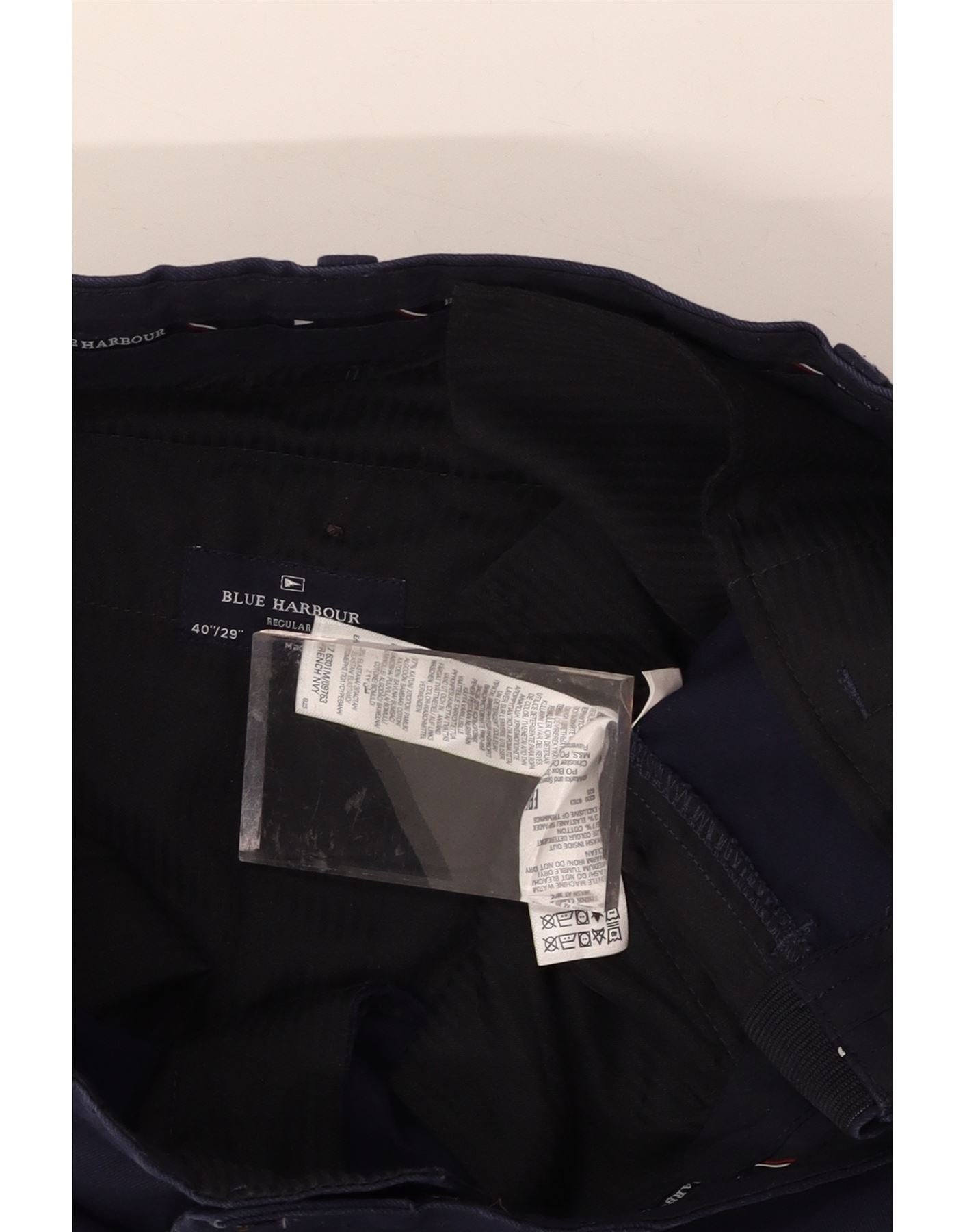 - AI Description: Elevate your wardrobe with these pre-owned Blue Harbour chino trousers. Crafted from woven cotton in a versatile navy blue, these classic-style trousers offer a comfortable, regular fit. Features include button closure, pockets, and stretch fabric for ease of movement. The design is further enhanced with button accents. The trousers also boast an elastic and adjustable waist for an optimum fit. Perfect for smart-casual occasions.