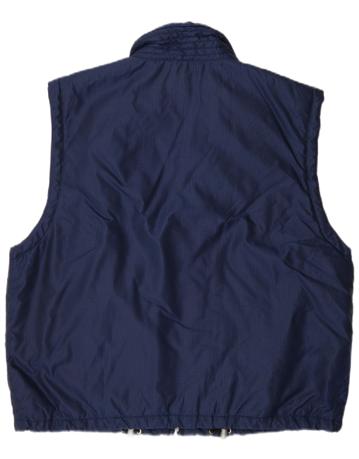 - AI Description: This Vintage mens waistcoat is crafted from a navy blue woven fabric, offering a lightweight and windproof design. It features a collared neckline and a full zip closure for practicality. The sleeveless cut provides excellent freedom of movement. A regular fit ensures comfortable wear. The fabric displays a subtle flecked pattern, adding visual interest. Zipped pockets offer secure storage. An embroidered logo detail completes the look.