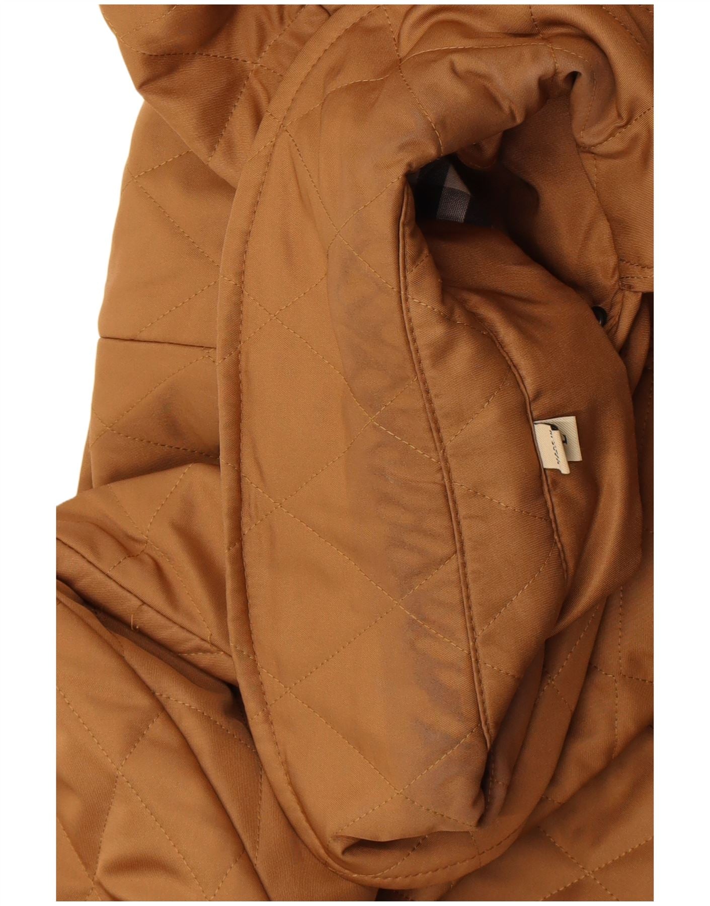 - AI Description: This Burberry womens quilted jacket is crafted from woven polyester with a distinctive quilted finish. Its rich brown hue offers classic versatility. It features a smart collared neckline and long sleeves. The regular fit ensures comfortable wear. A button-up front provides a neat closure. Practical pockets are integrated into the design. The iconic check pattern lines the interior and cuffs, adding a signature touch.
