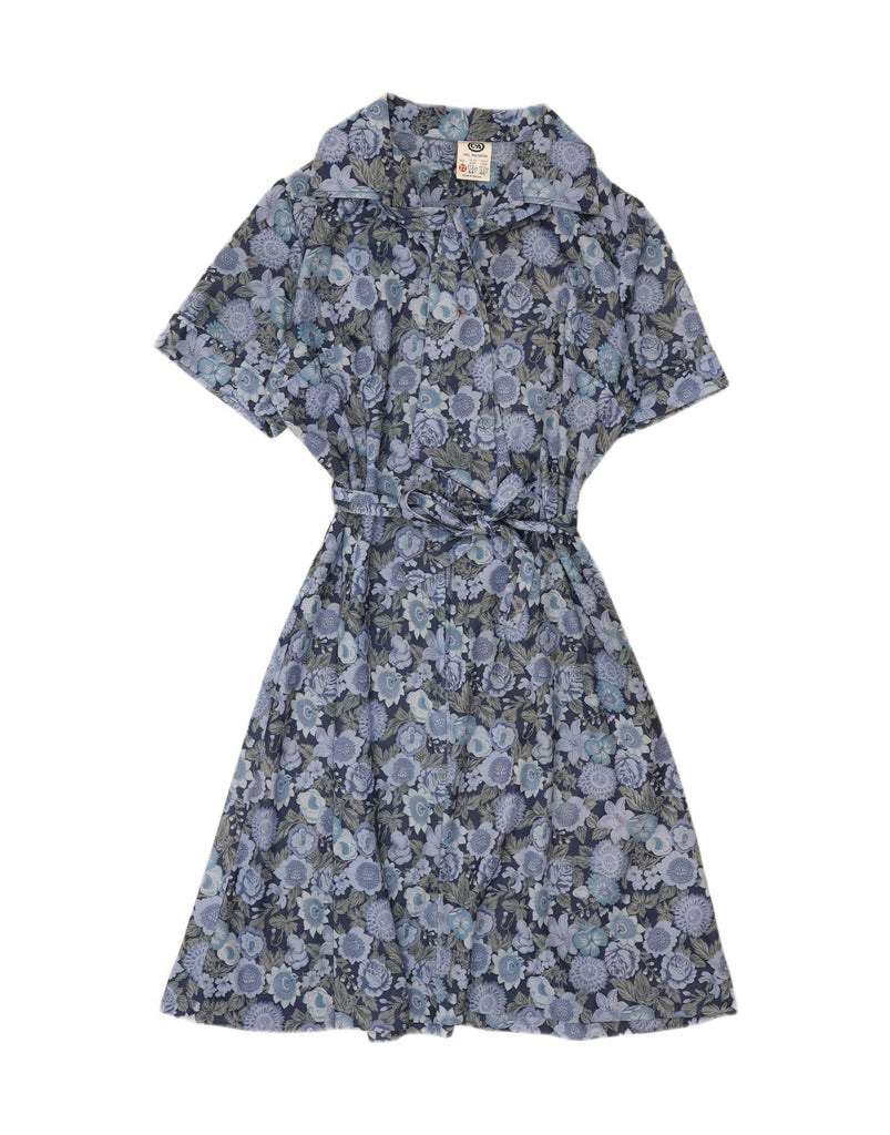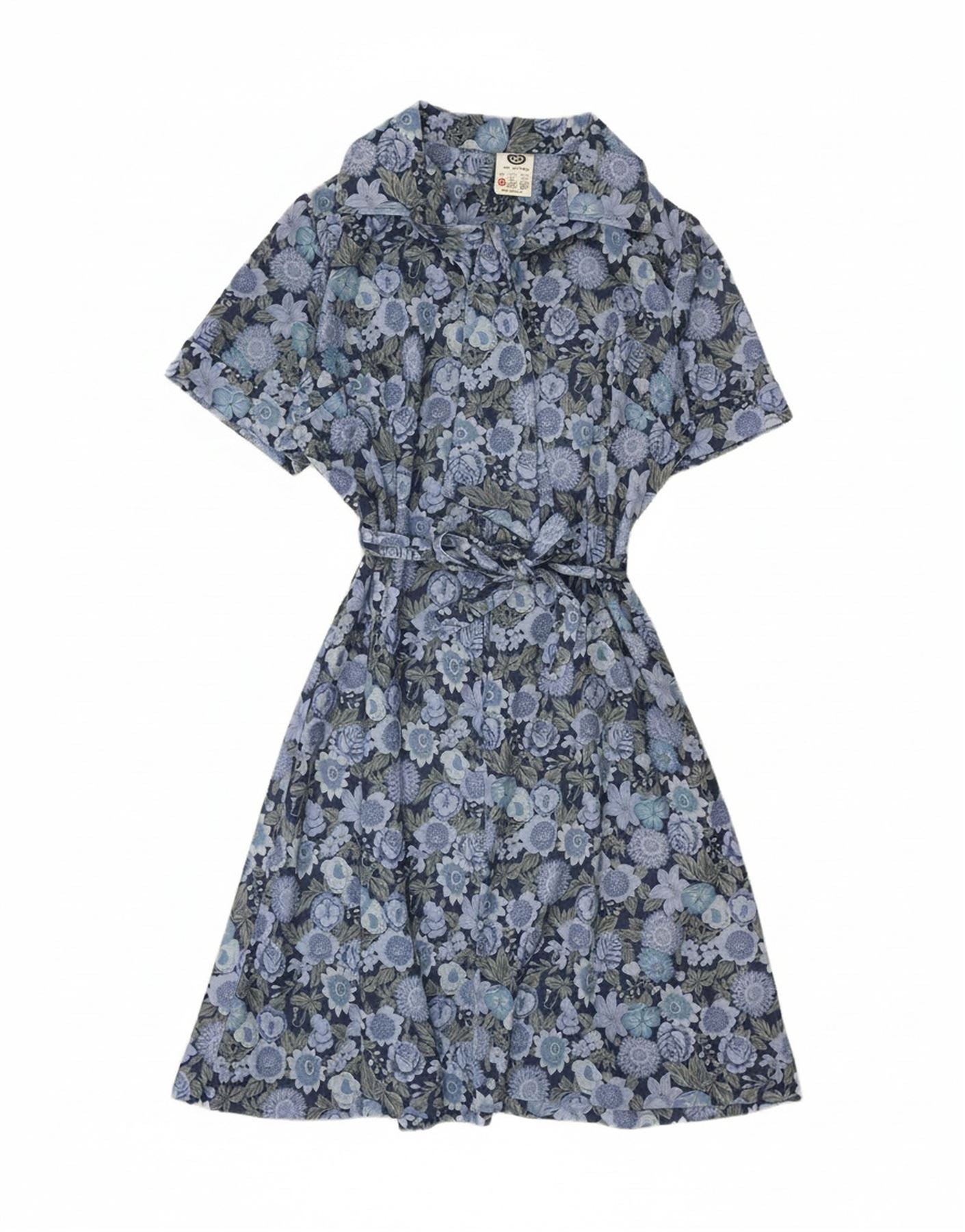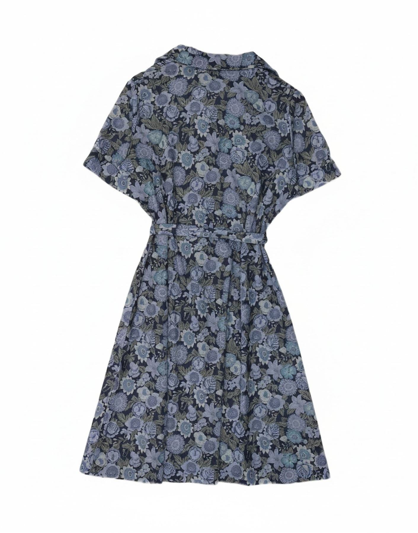 - AI Description: This C&A womens shirt dress is crafted from a blue 100 percent polyester woven fabric. It features a sharp collared neckline and a full button front closure. The short sleeves and regular fit offer comfort and style. A matching belt with a buckle cinches the waist, creating a flattering silhouette. Practical pockets add functionality. The all-over floral pattern provides a vibrant, classic feel.
