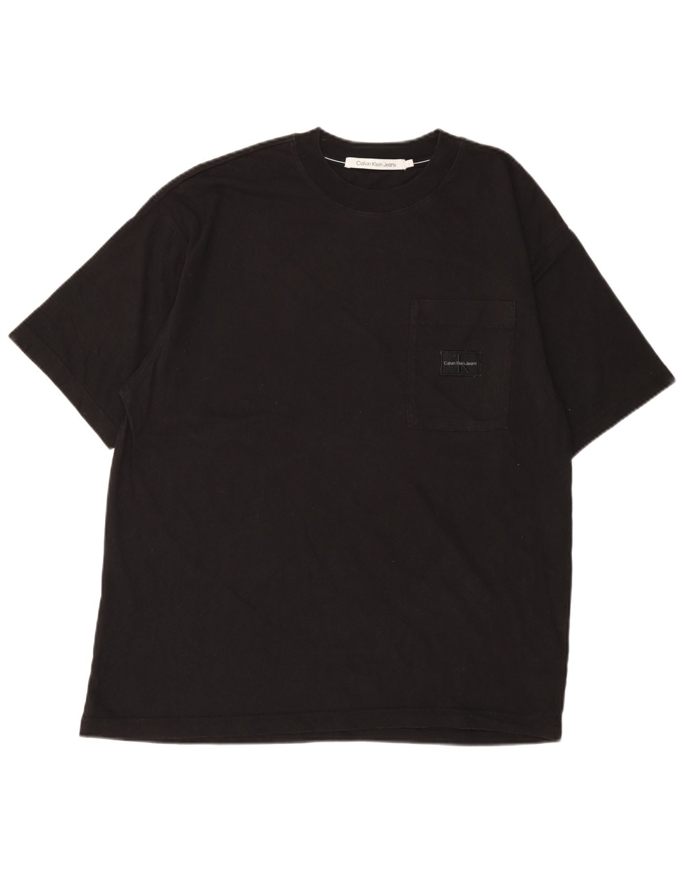 - AI Description: This Calvin Klein Jeans mens T-shirt is crafted from soft black cotton jersey. It features a classic round neck and short sleeves. The regular fit ensures comfortable wear. A subtle chest pocket with a tonal logo adds a signature touch. This pullover design offers effortless style for everyday wear.