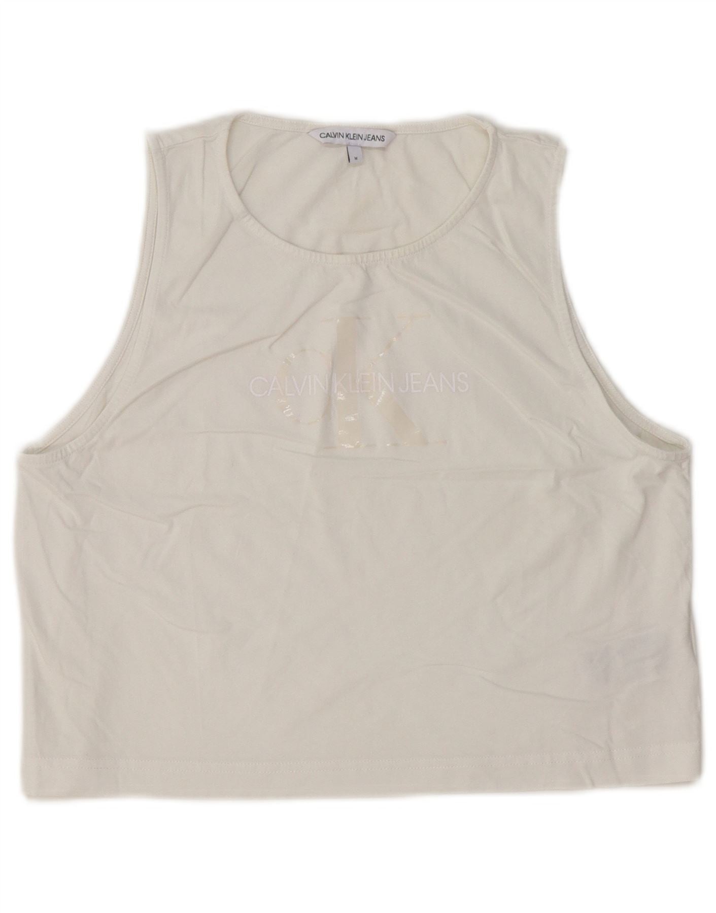 Calvin Klein Jeans Womens Crop Graphic Vest Top UK 12 Medium White Cotton