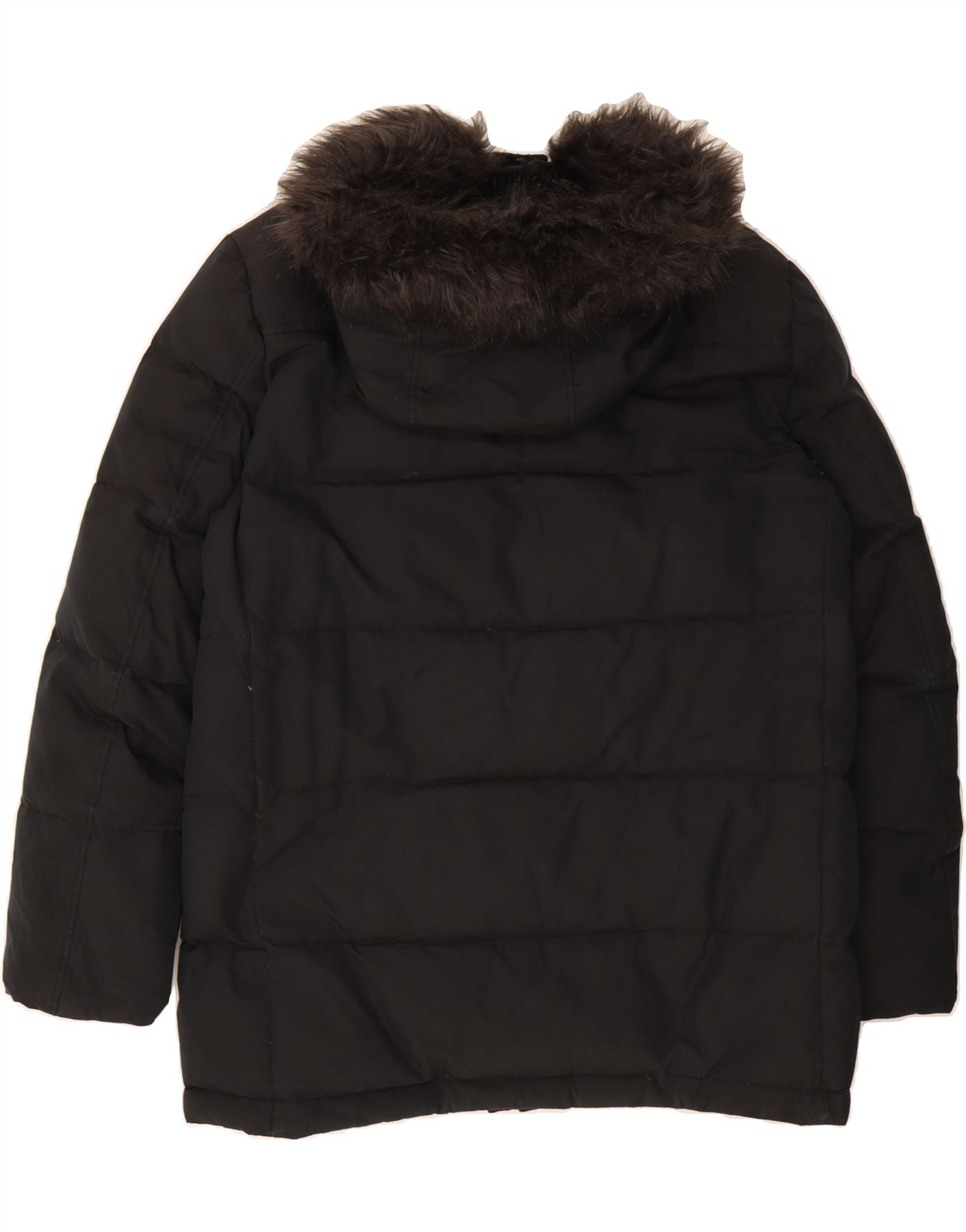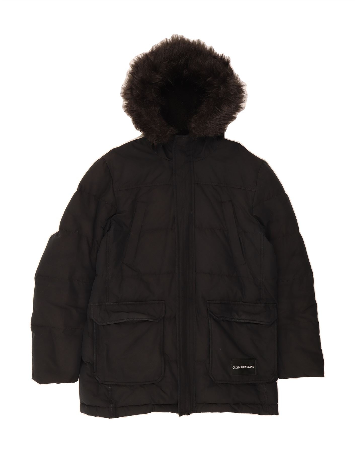 - AI Description: This pre-owned Calvin Klein men's padded jacket is a modern, hooded design in classic black. Featuring a regular fit, long sleeves and a secure zip closure, this down-filled jacket includes practical pockets and a removable hood. The fur trim accent adds a touch of style. Condition is excellent, with minor visible wear and stains on the label. Label size L.