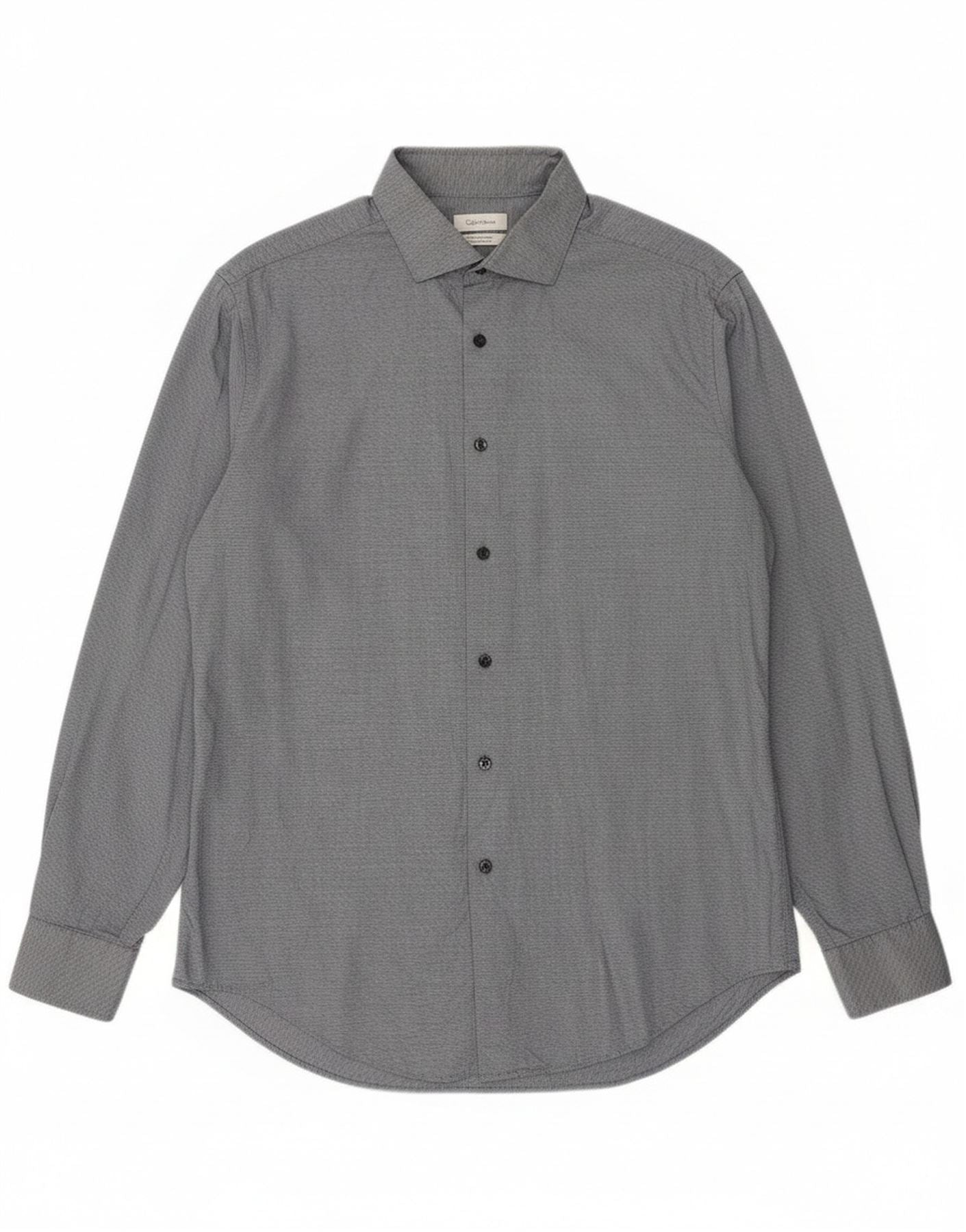 - AI Description: This Calvin Klein mens shirt is crafted from a woven fabric with stretch, offering comfort and a refined texture. It features a classic collared neckline and long sleeves with buttoned cuffs. The slim fit provides a modern, tailored silhouette. A subtle geometric pattern in navy blue adds visual interest. The full button-up front ensures a smart finish. This shirt is perfect for a sophisticated, contemporary look.