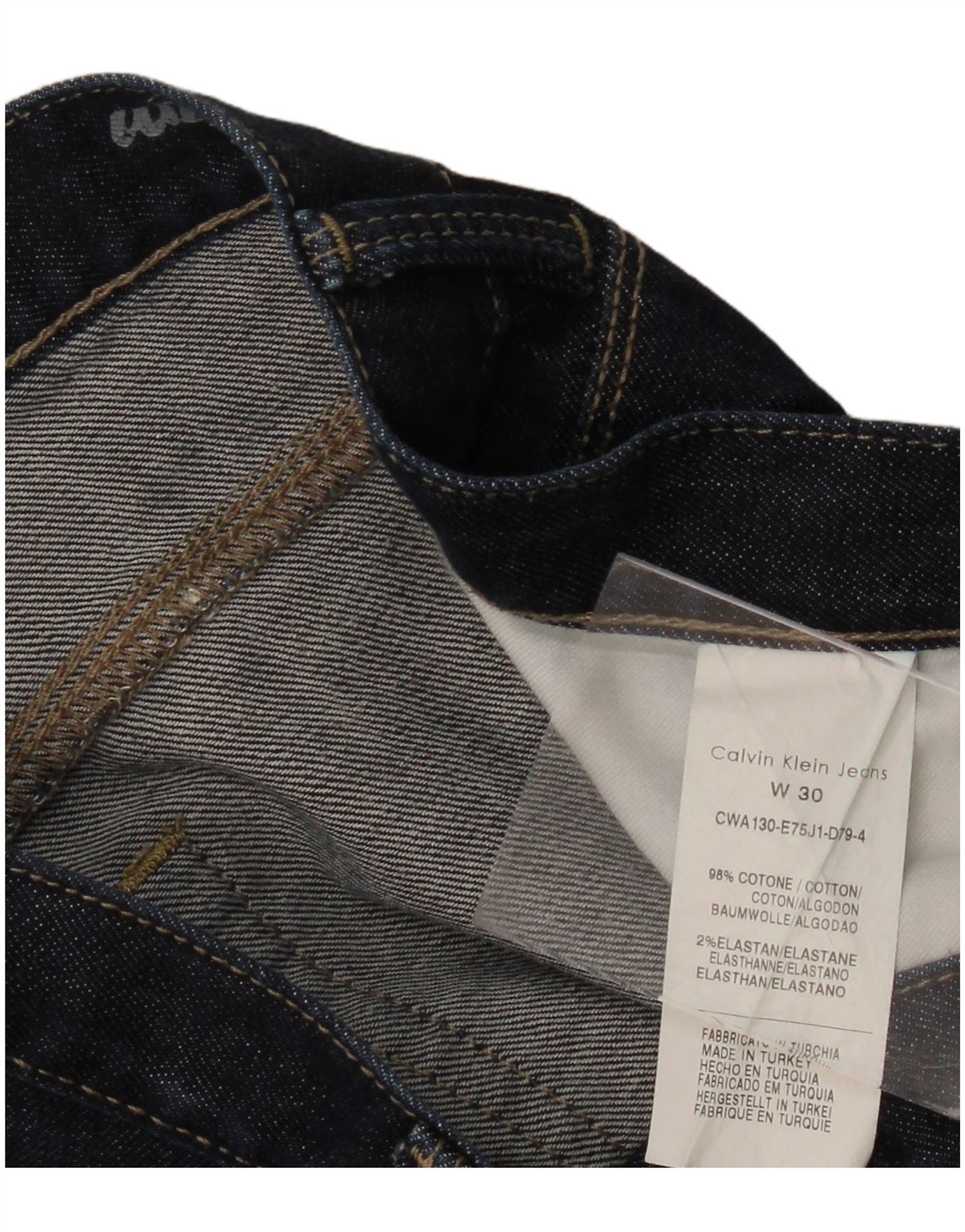- AI Description: These Calvin Klein Jeans womens wide leg jeans are crafted from a navy blue stretch denim. The 98 percent cotton and 2 percent elastane blend offers comfort and flexibility. They feature a mid-rise waist and a button closure. The relaxed fit flows into a wide leg silhouette. Classic five-pocket styling and a subtle brand logo on the rear pocket complete the design. These jeans provide both style and ease of movement.