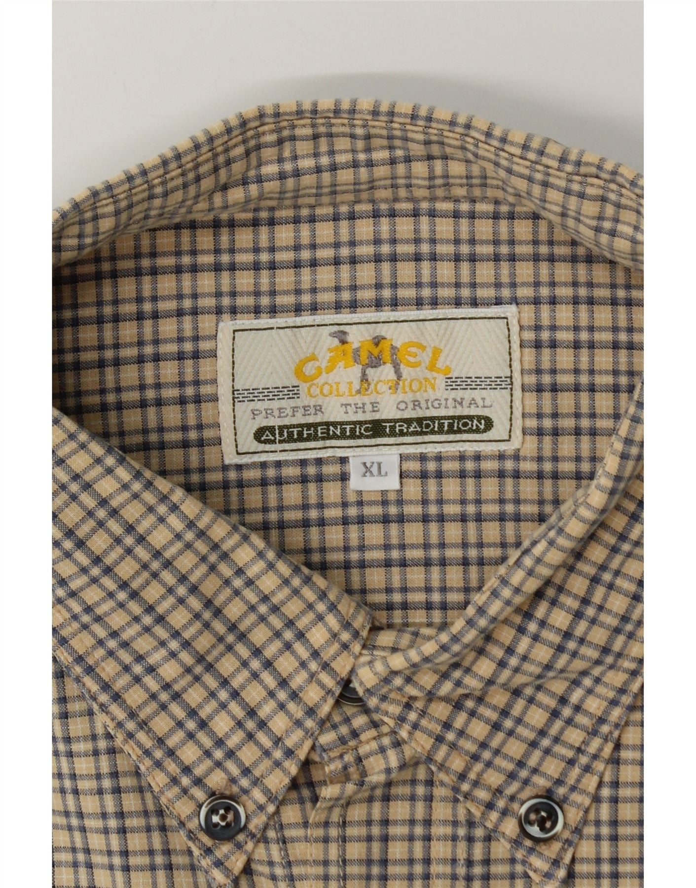 - AI Description: This Camel mens shirt is crafted from a beige woven fabric with a smooth texture. It features a classic check pattern in beige and dark blue tones. Tonal buttons secure the front and cuffs. An embroidered logo is visible on the chest. The collared neckline and long sleeves offer a traditional silhouette. Twin chest pockets add practical detail. Its regular fit ensures comfortable wear.