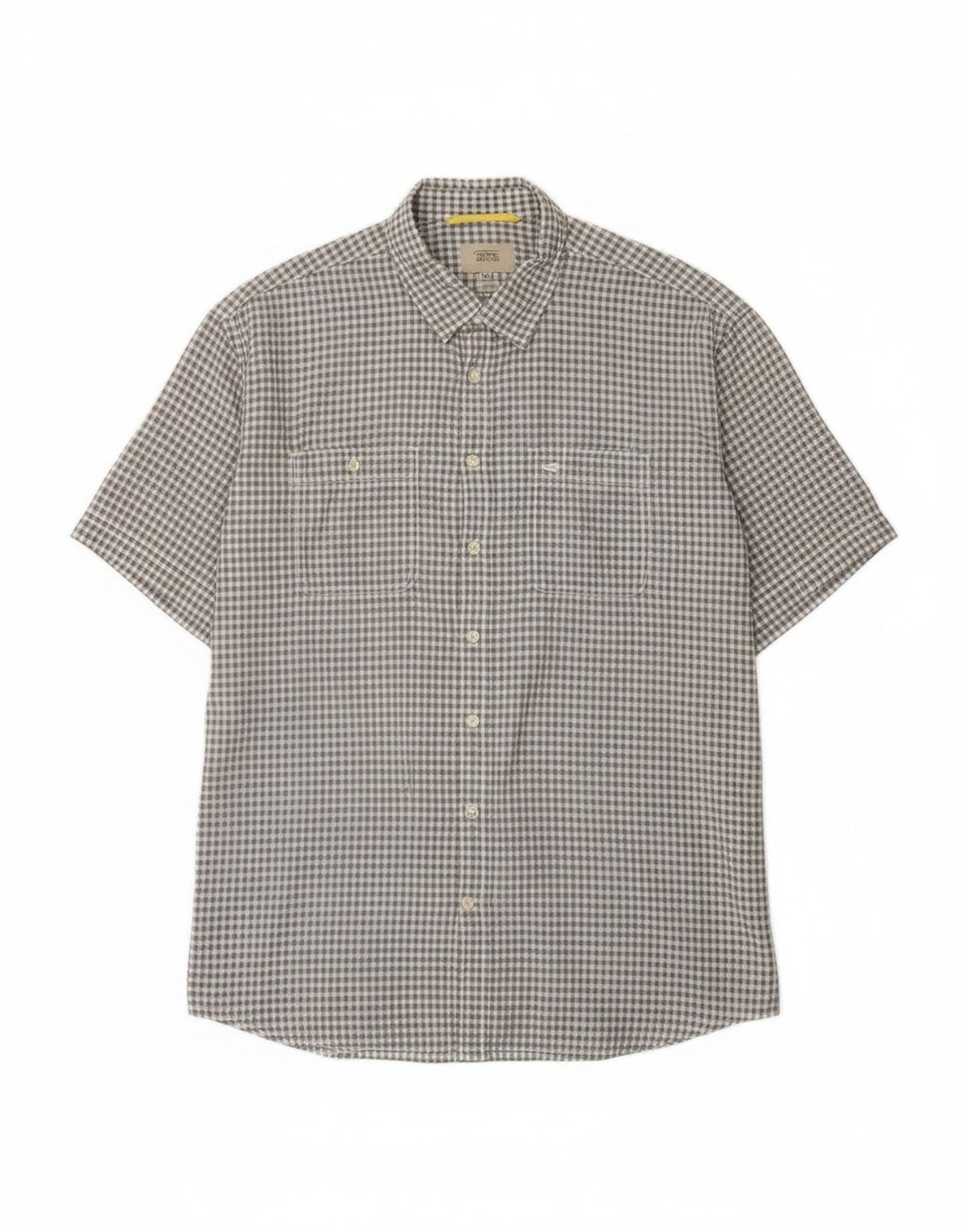 - AI Description: This Camel Active mens shirt is crafted from 100 percent cotton woven fabric. It features a classic grey and white check pattern. The shirt has a collared neckline and a full button-up front. Short sleeves and a regular fit ensure comfortable wear. Two chest pockets add practical detailing. This design offers a timeless, smart casual aesthetic, perfect for everyday style.