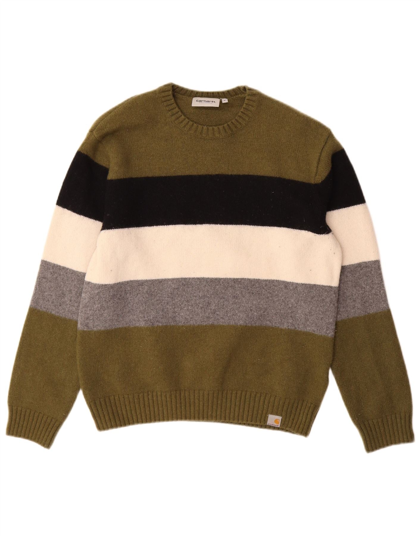 CARHARTT Mens Crew Neck Jumper Sweater Medium Khaki Striped Lambswool