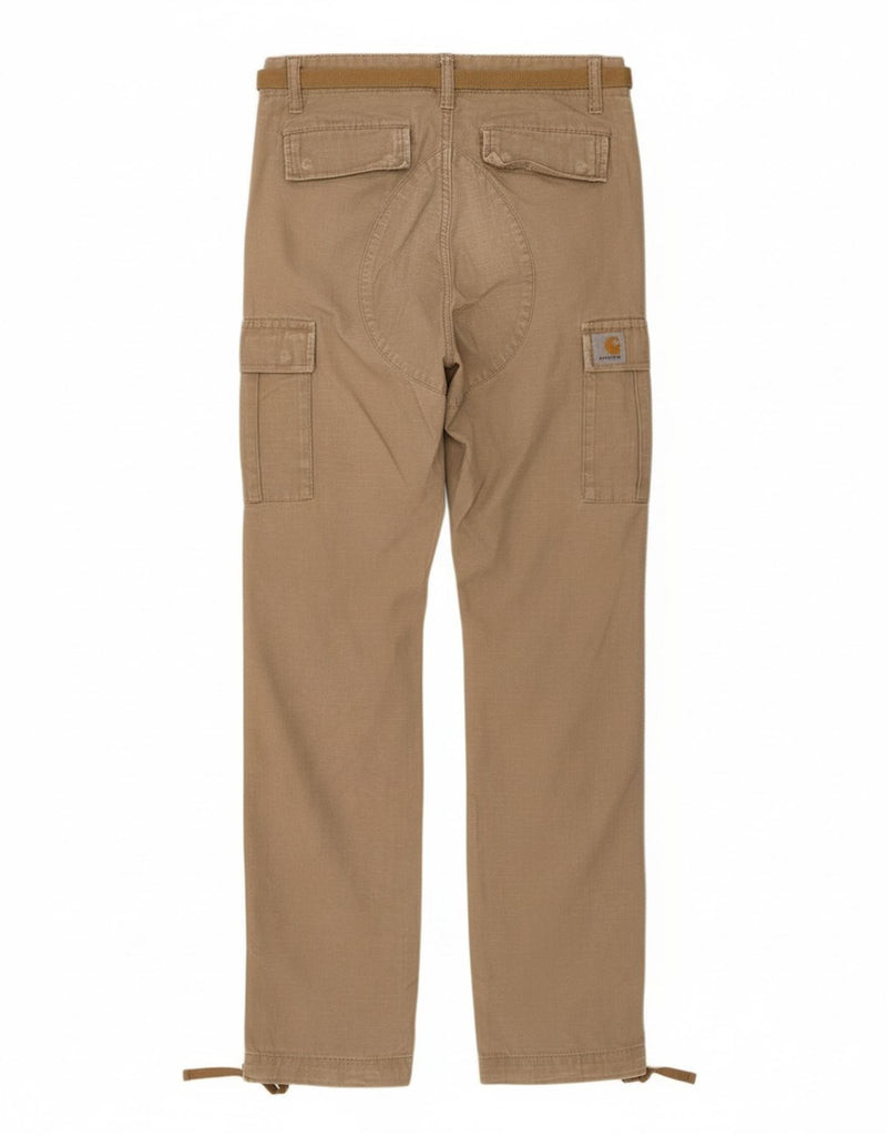 - AI Description: This Carhartt men's cargo trousers are crafted from durable beige cotton with a woven texture. The regular fit offers comfortable wear. A button closure and adjustable waist buckles ensure a secure fit. Multiple pockets provide practical storage. The cuffed ankles give a neat finish. This army style staple combines utility with enduring design.