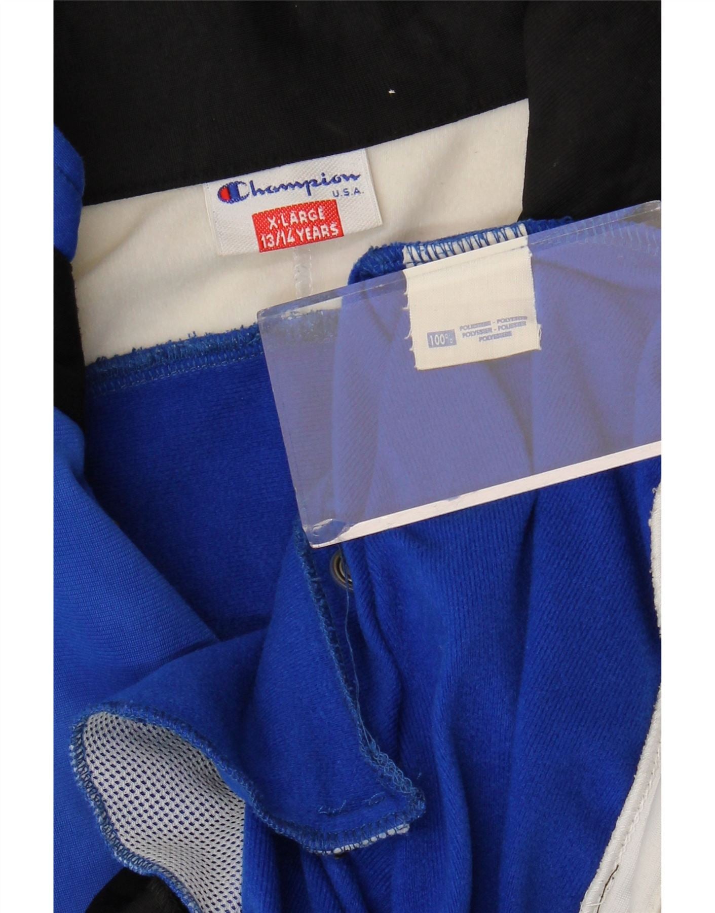 - AI Description: This Champion boys' Bomber Jacket is crafted from lightweight 100 percent polyester jersey. It features a striking blue, white, and black colourblock pattern. The high neck and snap closure offer a sporty, clean finish. Short sleeves and a regular fit ensure comfortable movement. Practical pockets and a prominent logo accent complete this athletic design.