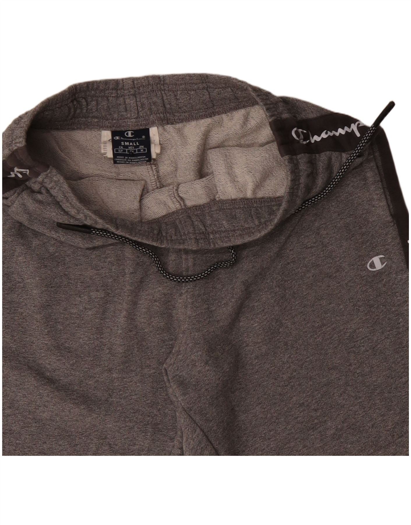 - AI Description: This Champion mens casual shorts are crafted from a comfortable grey cotton blend jersey. They feature an elasticated drawstring waist for an adjustable, regular fit. Side pockets offer practical storage. The design is accented with branded logo tape running down each side, adding a distinctive graphic detail. These shorts provide both comfort and a sporty style.