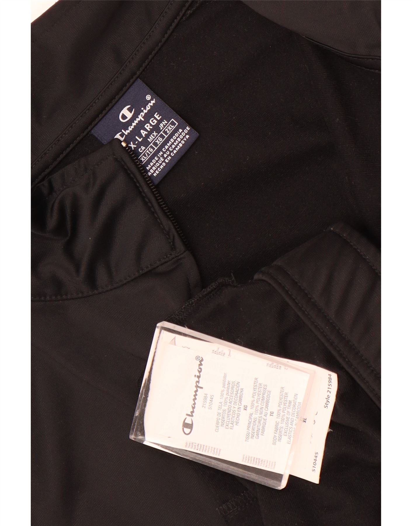 - AI Description: This Champion mens tracksuit top jacket is crafted from smooth black polyester jersey. It features a high neck and a full zip closure for versatile wear. Long sleeves end in comfortable cuffs. Branded logo tape runs down each sleeve, adding a distinctive graphic detail. The regular fit ensures ease of movement. Practical pockets are included for convenience.