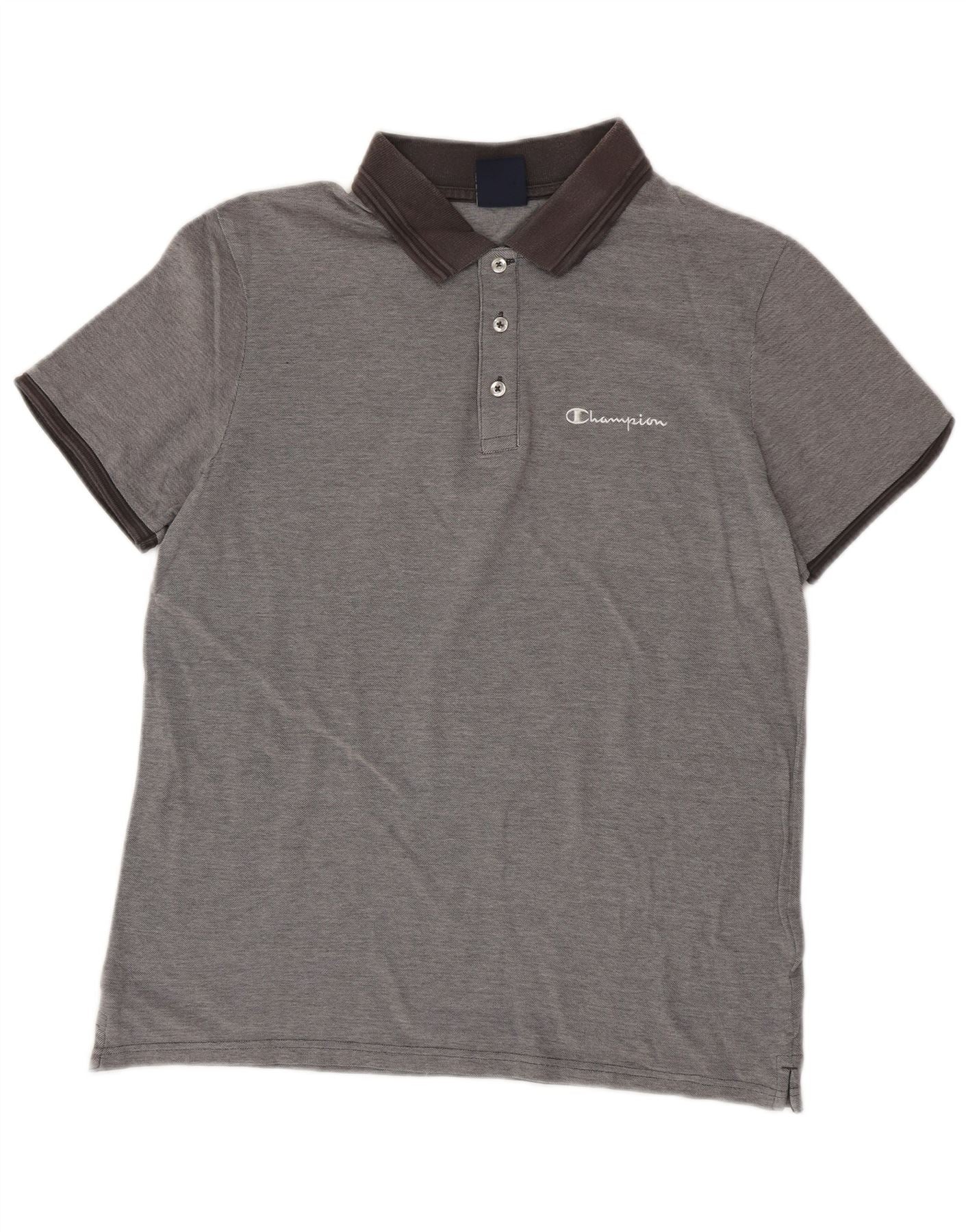 - AI Description: This Champion mens Polo Shirt is crafted from a comfortable grey knit fabric. It features a classic collared neckline in a contrasting brown hue. Short sleeves also have brown trim. The button-up placket adds traditional detail. An embroidered Champion logo adorns the chest. The regular fit ensures a comfortable and versatile silhouette, perfect for everyday wear.