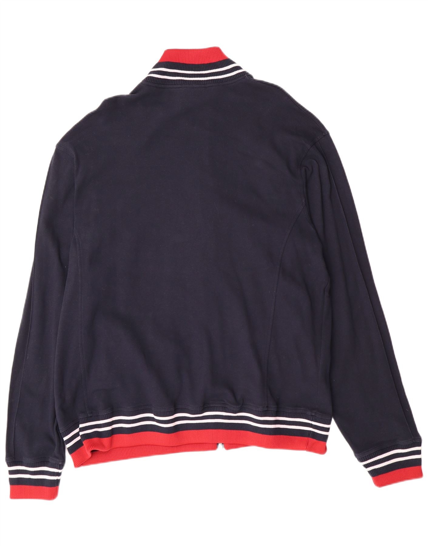 - AI Description: This Champion mens tracksuit top jacket is crafted from soft navy blue 100 percent cotton jersey. It features a collared neckline with red and white stripe detailing. Long sleeves and a regular fit ensure comfort. A full zip closure runs down the front. The ribbed cuffs and hem also boast matching red and white stripes. Two practical pockets are included. A subtle Champion logo adds a signature touch.