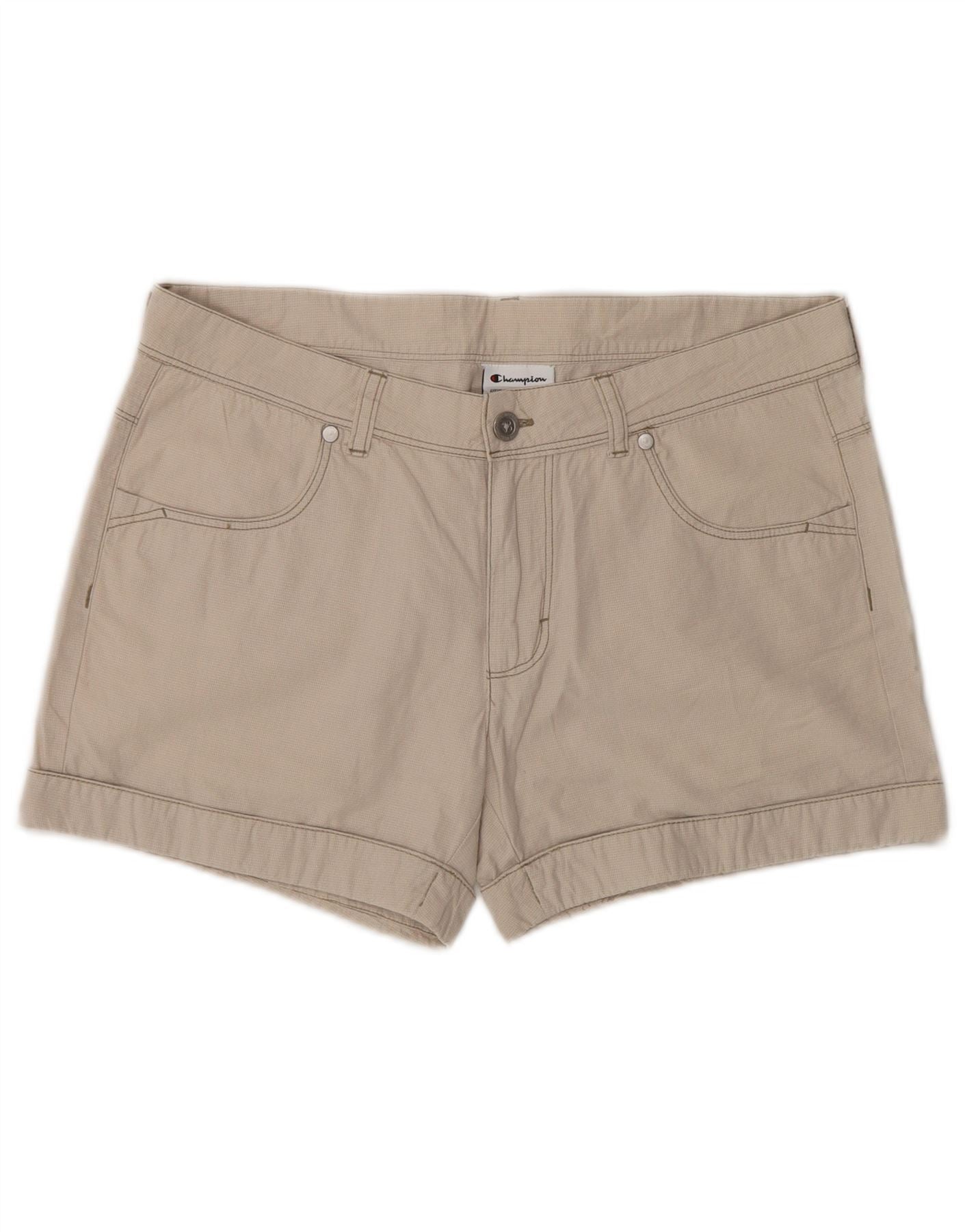 - AI Description: This Champion womens Chino Shorts are crafted from a beige woven fabric, offering a smooth yet durable texture. They feature a regular fit and a zip closure for a clean front. The design includes practical pockets and stylish cuffed hems. A classic button accent completes the look, ensuring timeless appeal for everyday wear.