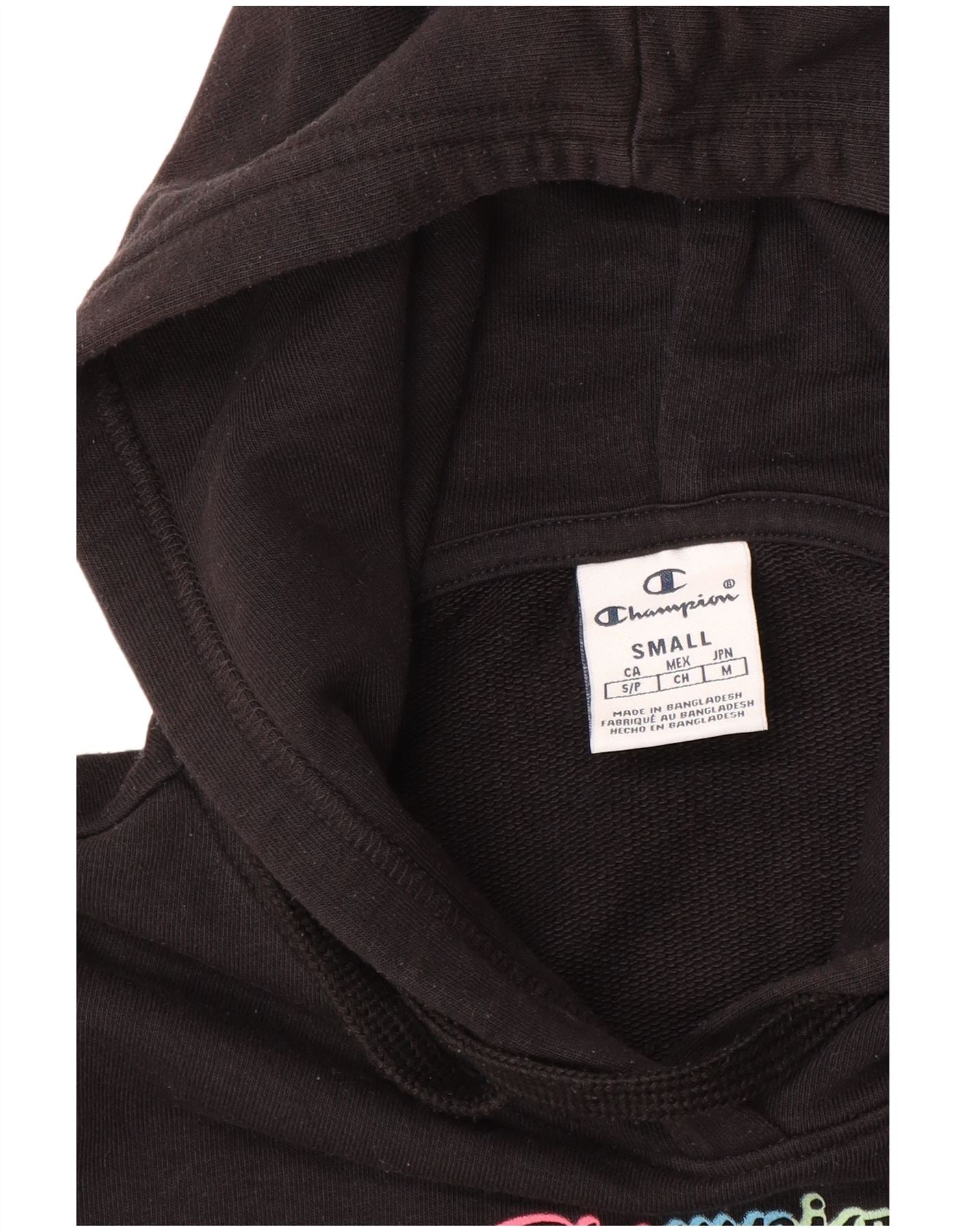 - AI Description: This Champion womens hoodie jumper is crafted from soft black jersey fabric. It features a comfortable hooded neckline and long cuffed sleeves. The pullover design offers a regular fit. A colourful graphic logo adorns the chest. Vibrant abstract patterns decorate both sleeves, adding a modern touch.