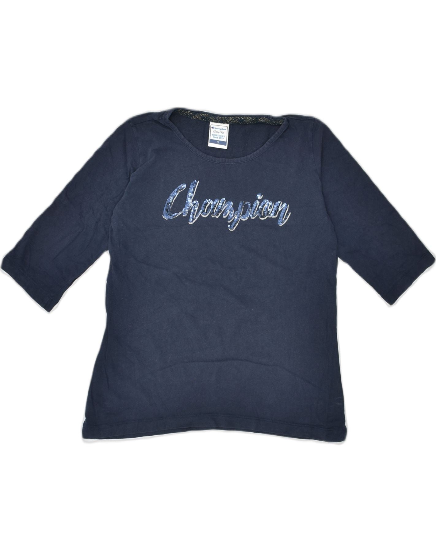 CHAMPION Womens Graphic Top 3/4 Sleeve UK 10 Small Navy Blue Cotton