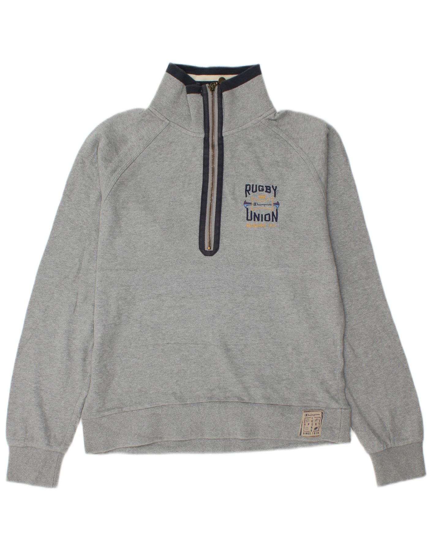 - AI Description: This Champion boys zip neck jumper sweater is crafted from soft grey jersey fleece. It features a high collared neckline with a practical quarter zip closure. Long sleeves and a regular fit ensure comfort and ease of movement. An embroidered Rugby Union graphic adorns the front, adding a distinctive sporting detail. This piece is perfect for active wear or casual layering.