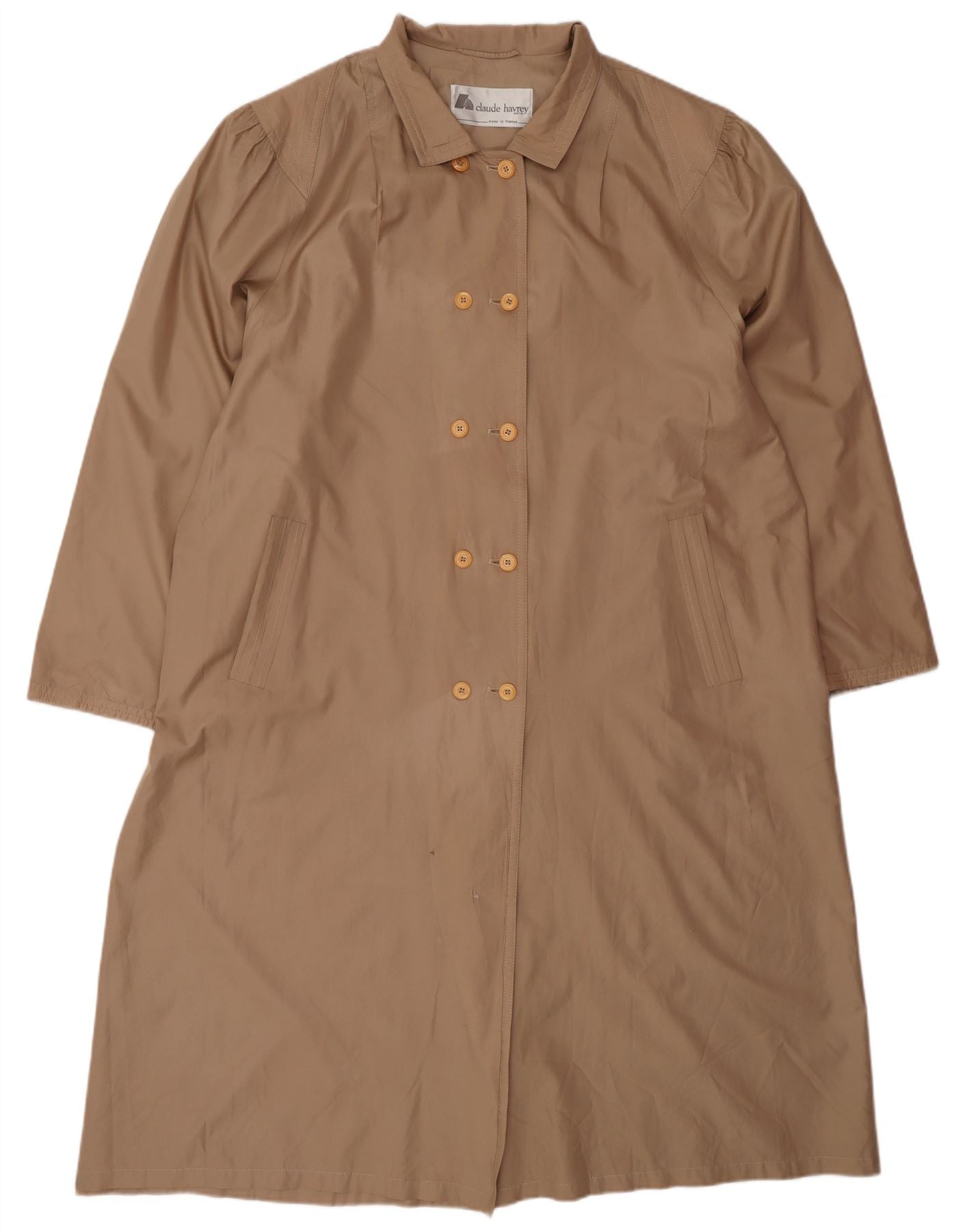 - AI Description: This Claude Havrey womens raincoat is crafted from lightweight beige polyester woven fabric. It features a classic collared neckline and long sleeves. The button-up front closure is accented with tonal buttons. This waterproof coat offers a regular fit for comfortable wear. It includes practical pockets, blending functionality with a timeless style.