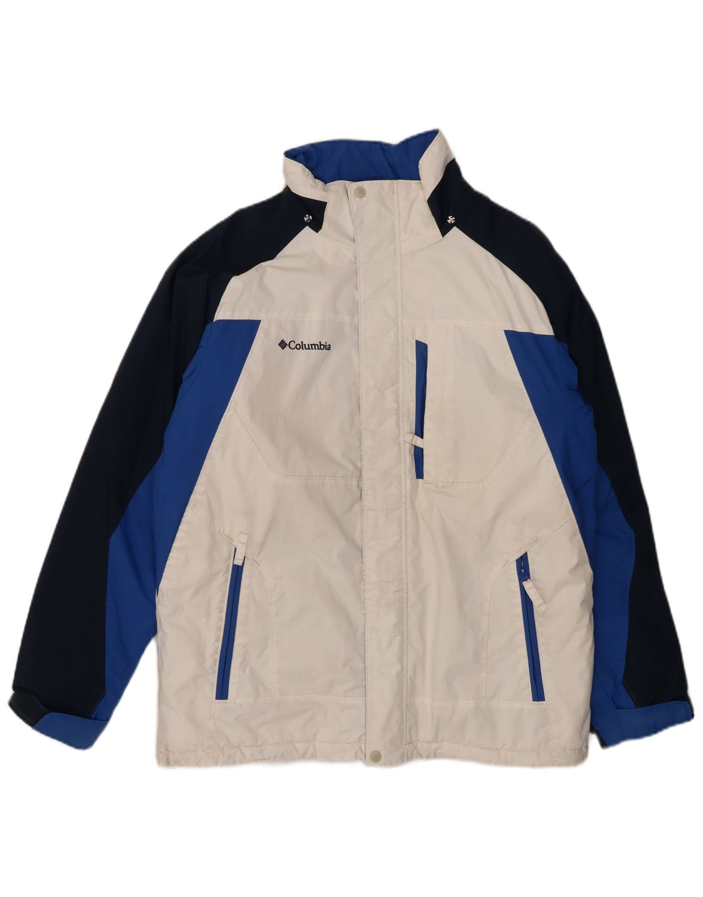 - AI Description: This Columbia mens Padded Jacket is crafted from durable nylon, offering a smooth, weather-resistant finish. It features a striking colourblock pattern in white, blue, and navy blue. The collared neckline and full zip closure provide excellent protection. Long sleeves and a regular fit ensure comfort and mobility. Practical pockets and adjustable features complete this functional, stylish piece.