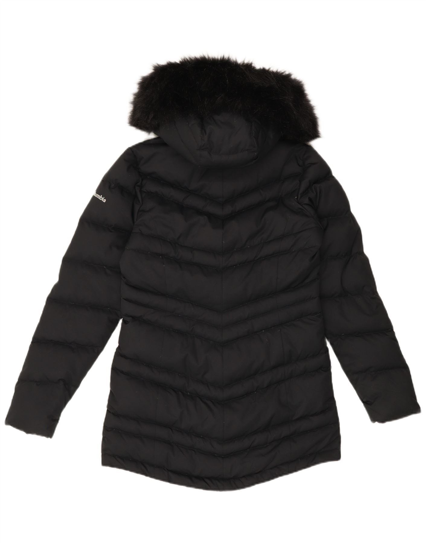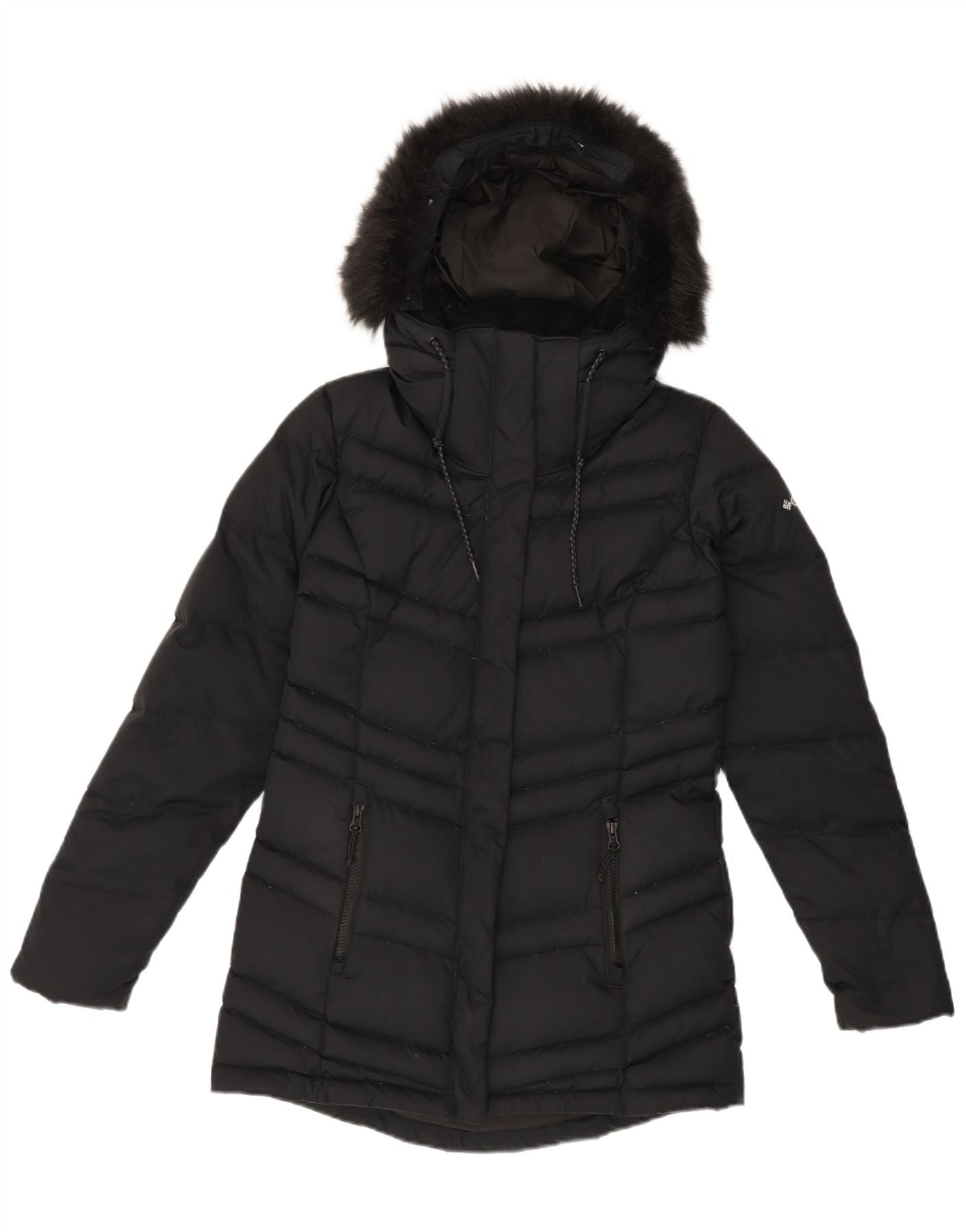 - AI Description: This Columbia womens padded jacket is crafted from durable black woven fabric, offering a padded, thermal design. It features a high neck and long sleeves for warmth. The regular fit ensures comfortable layering. A practical zip closure secures the front. It includes a hooded design with a stylish fur trim. Zipped pockets provide secure storage, making it ideal for winter wear.