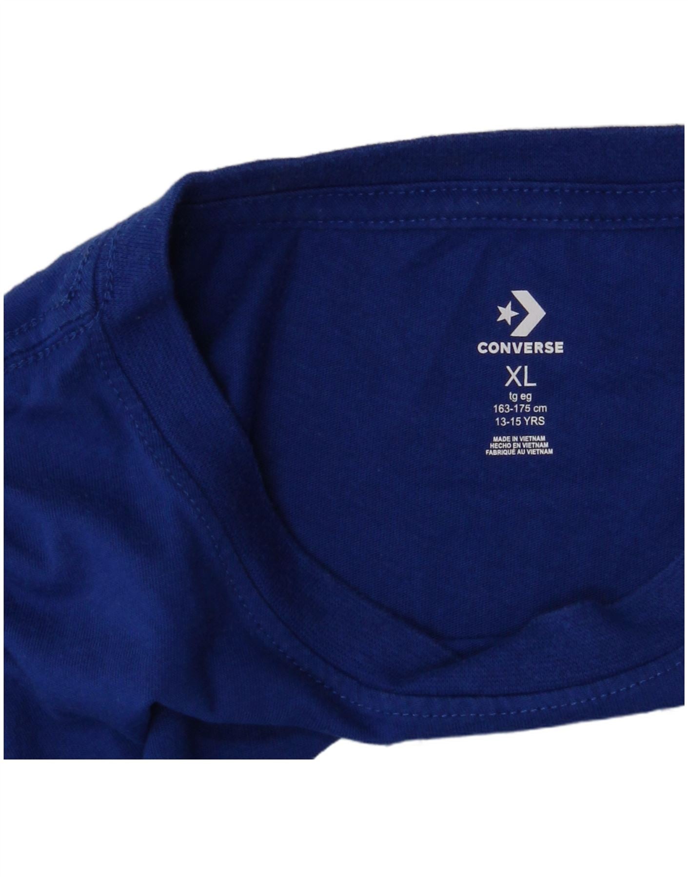 - AI Description: This Converse boys graphic T-shirt top is crafted from soft blue jersey fabric. It features a classic round neck and short sleeves. The regular fit ensures comfortable wear for everyday activities. A prominent Chuck Taylor All Star logo graphic adorns the front, adding an iconic touch. A subtle brand detail is also present on the sleeve, completing the design with signature style.