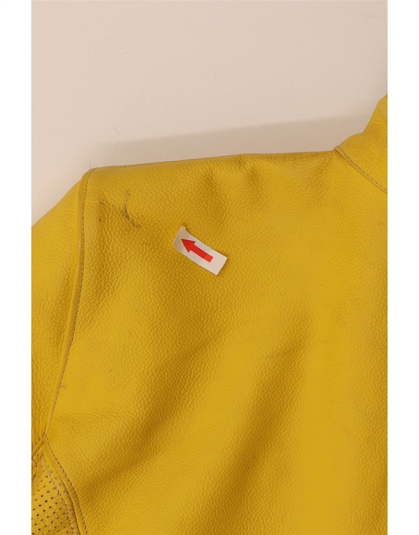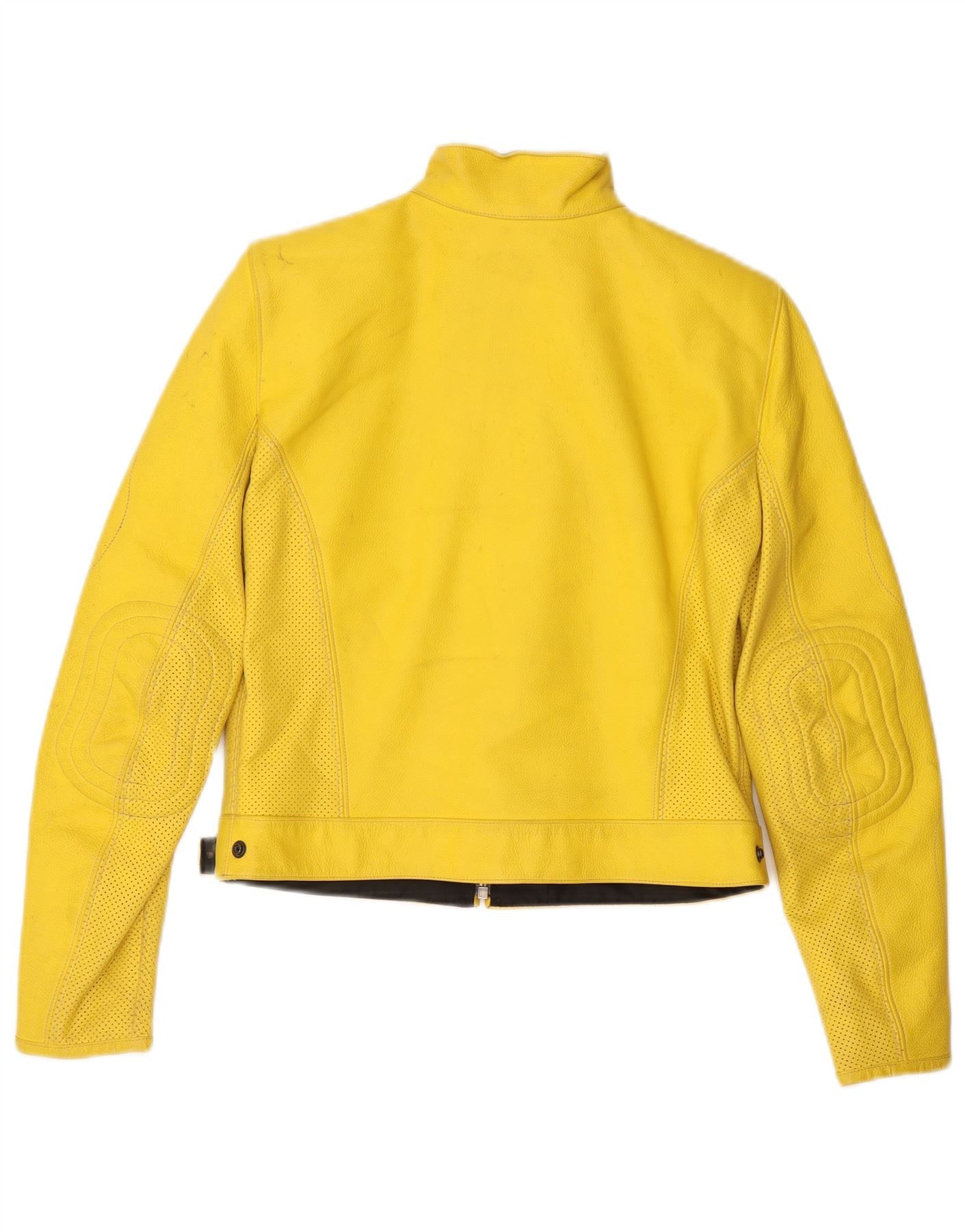 - AI Description: This Corner womens Biker Jacket is crafted from vibrant yellow leather, offering a smooth yet durable texture. It features a collared neckline and long sleeves, designed for a slim fit. The front zip closure ensures a sleek silhouette. Zipped pockets add practical detail and a moto racer aesthetic. Perforated panels enhance breathability and style, completing this striking piece.