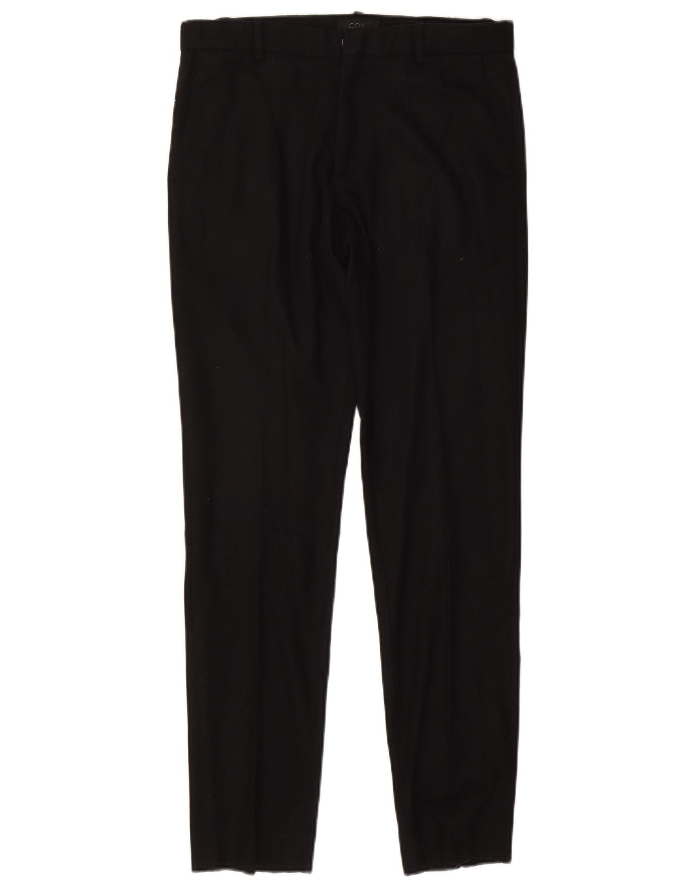 - AI Description: These Cos women's trousers are crafted from a smooth black woven fabric. They feature a mid-rise waist and a zip closure for a sleek front. The slim fit design tapers neatly through the leg. Functional pockets add practicality. A subtle button accent completes the classic style, offering a refined and versatile garment for various occasions.