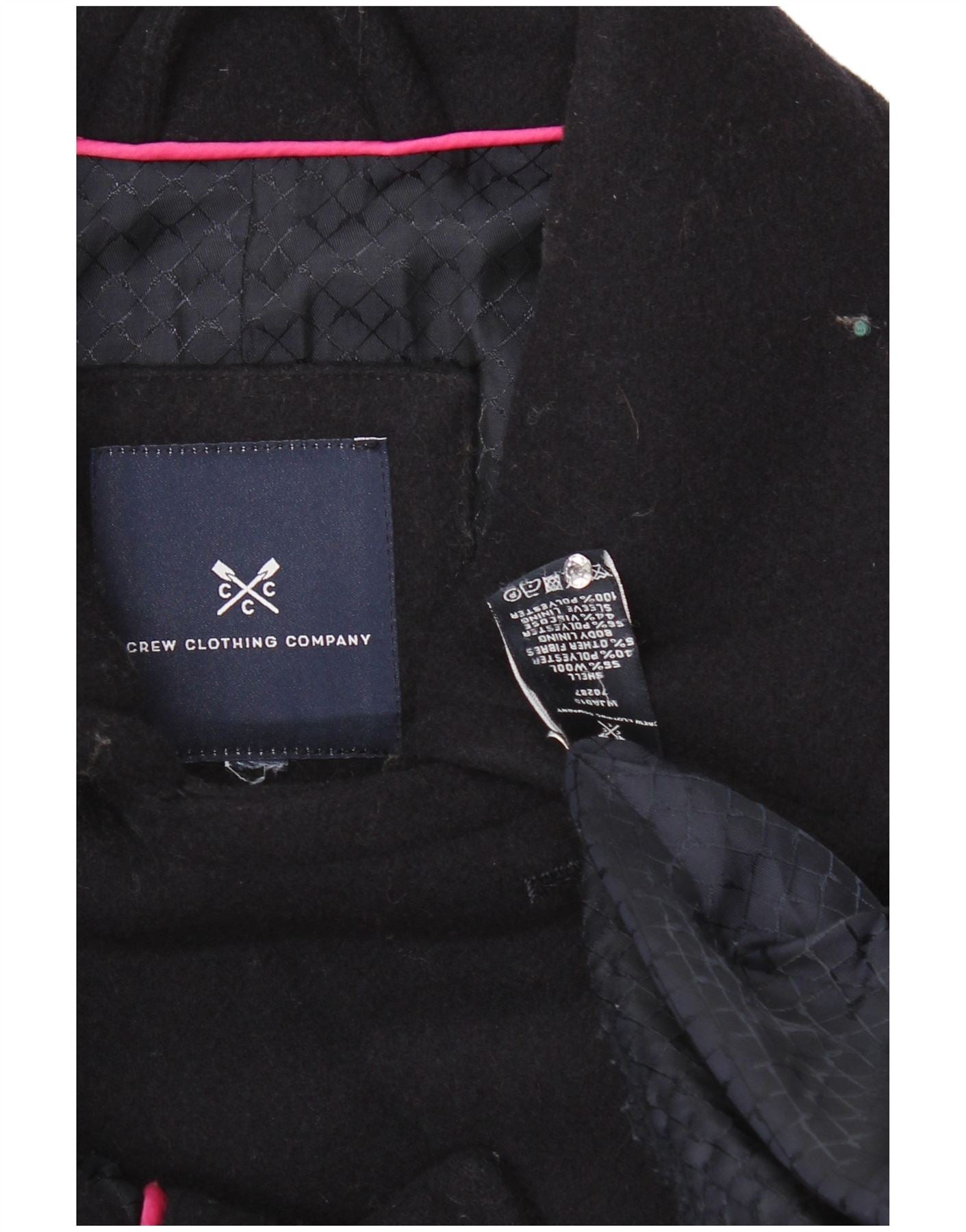- AI Description: This Crew Clothing Company womens pea coat is crafted from a rich navy blue wool blend. Its double breasted front features classic tonal buttons. A structured collared neckline and long sleeves define the silhouette. The regular fit offers comfortable wear. Practical pockets and a full lining complete this timeless, smart outerwear piece.